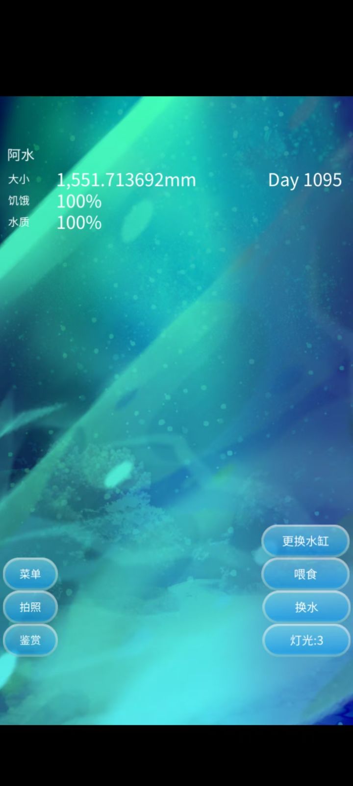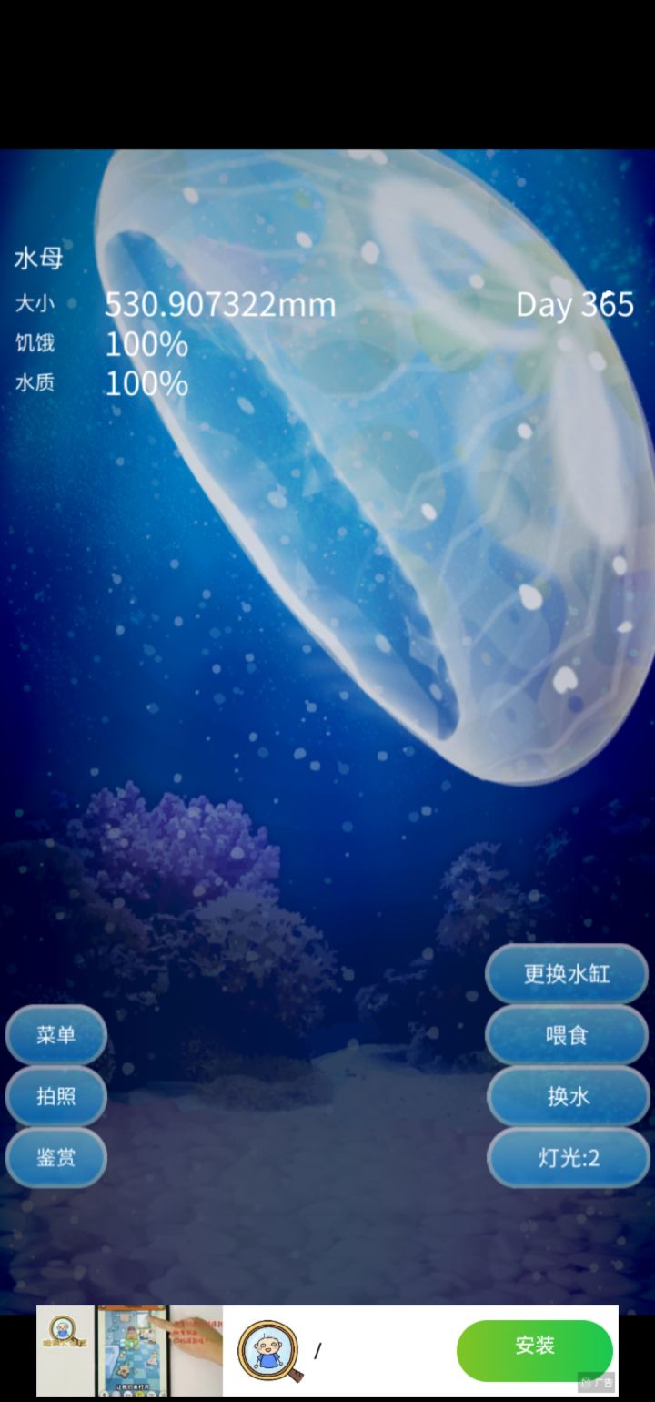 一岁啦!✧⁺⸜(●˙▾˙●)⸝⁺不过今天新出现一个功能是更换水缸,换的话水母会变小,暂时没有用过(:з っ )っ等它600大再说叭嘿嘿~所以更换水缸是大家都出现的新功能还是满一岁才有的功能嘞,不想变小,也不知道用一次会变多小,暂时不敢用(ó㉨ò)哦豁,刚刚仔细看了一下,第二张图是点了换水缸后的提示,所以意思只是说我的手机屏幕容纳不下我的水母所以相对地缩小水母,相对地扩大水缸。水母的真实大