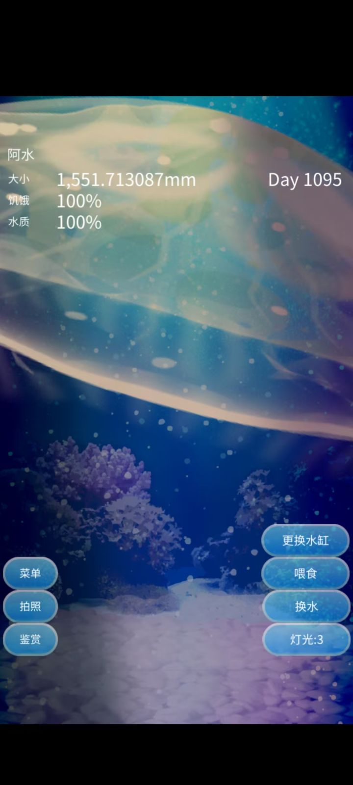 我一开始养水母没多久就死了,但是给我妈妈推荐了这个游戏,让她养个电子宠物,没想到已经三年了。前面两张是原始水缸的大小,后面是换的大水缸,最后是后来又换了一次大水缸的大小,真的好大好大一个!#游戏日常 #