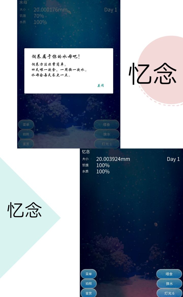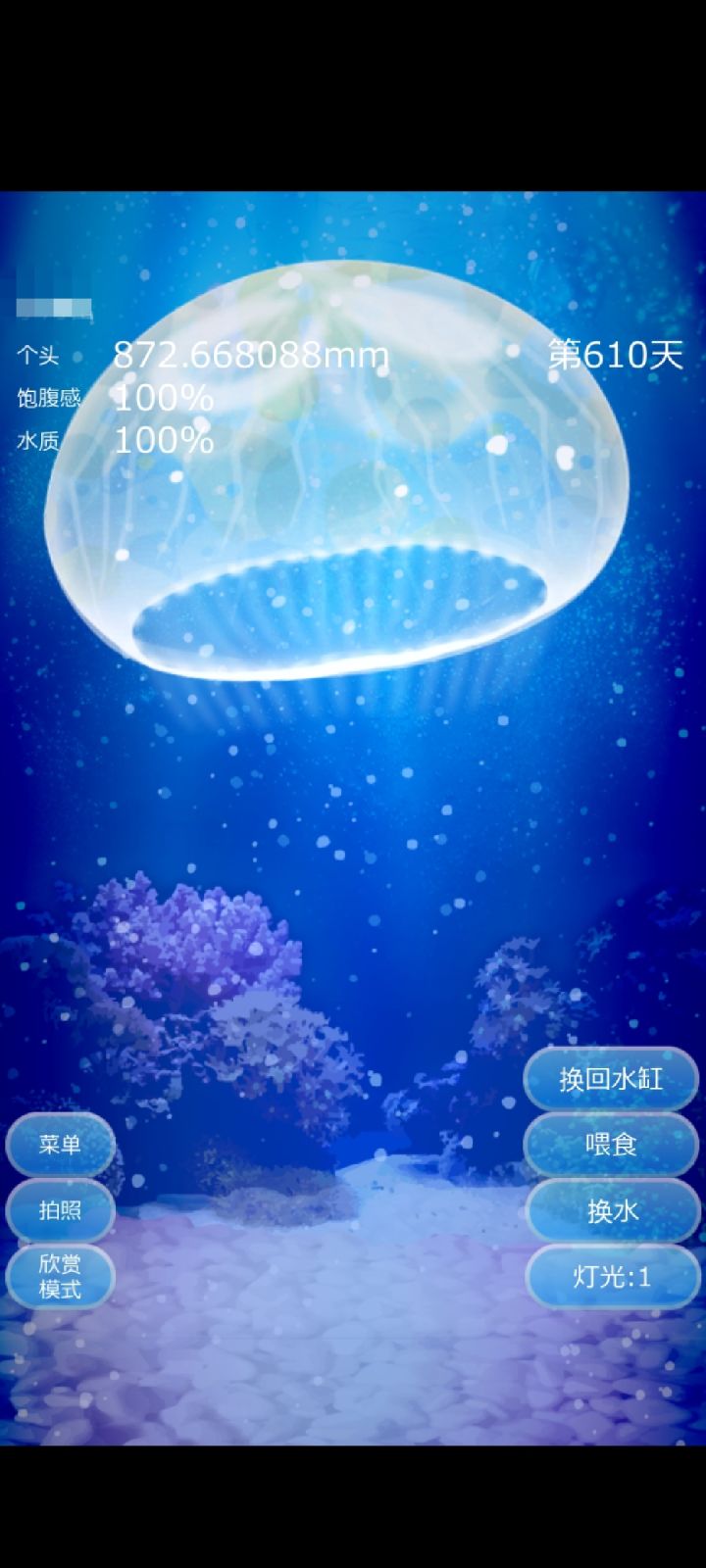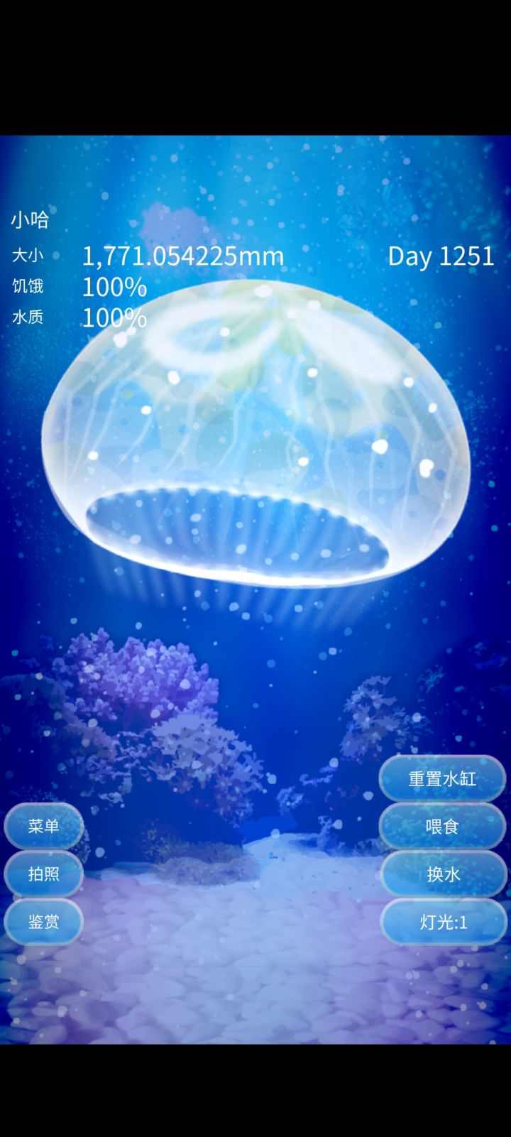 自从一年前手机更新了系统再也打不开,一直舍不得把软件删掉留在手机里做为我养了这么久的小水母的纪念,没想到今天突发奇想点开了这个软件!竟然打开了!呜呜呜,而且只有水质变为0%,还好没有饿嘎了!小哈,接下来的日子也请一直陪伴我!