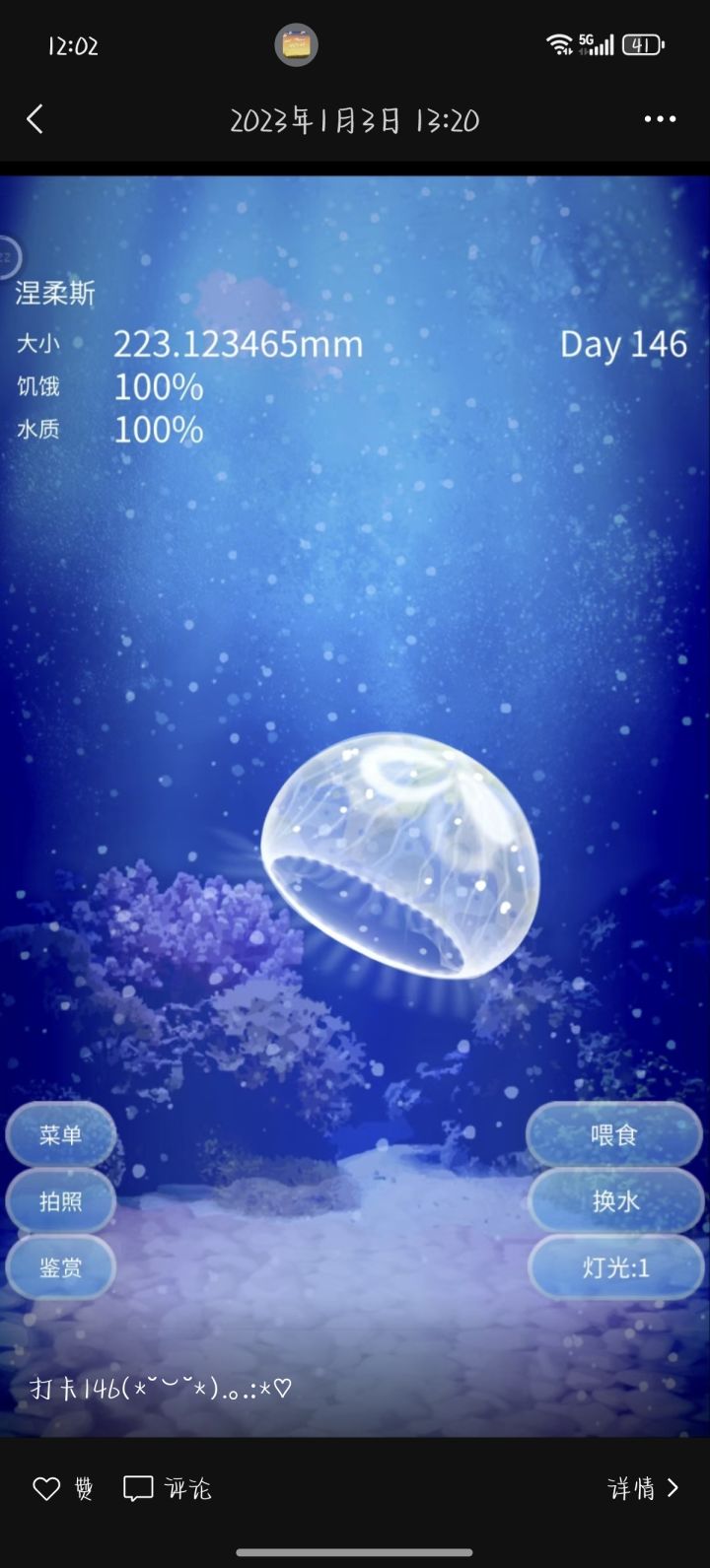 本来是怀着沉痛的心情打算抛弃她,因为要换手机了但是刚刚刷论坛发现竟然有存档码这种东西!!你们能相信吗?我这只水母是第2只认真养的,也就是说我玩这个月游戏2年多!刚知道!!有存档码!!天呐,大喜大悲莫过于此,感恩作者,感恩论坛里某不知名老哥,我差一点!差一点就要放生她了😭😭😭真的好开心,希望我是最后一个知道有存档码这种东西的人🙏🏻愿天下没有生离死别(顺说死了也可以调时间哦)