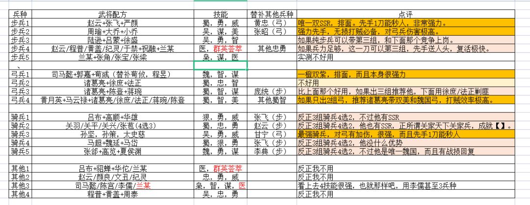 英雄:骑兵阵容。主吴国,孙坚、太史慈、孙策,这个阵容前期舒服,首先吴国克弓兵,而骑兵怕弓兵,前期发展快,攻击高,可以拼掉对方的弓兵伤害,其次首次伤害加90%+全伤害+15%,前期大部分可以一脚先踢死一个,形成三打二。中期配关羽、张苞和关兴,蜀国克步兵,骑兵克步兵,敌对步兵妥妥的~后期再招募魏国夏侯渊、张郃、高览,主要是三谋可以回35%的血…你懂的,就是大后期拼boss的时候能少点损失。