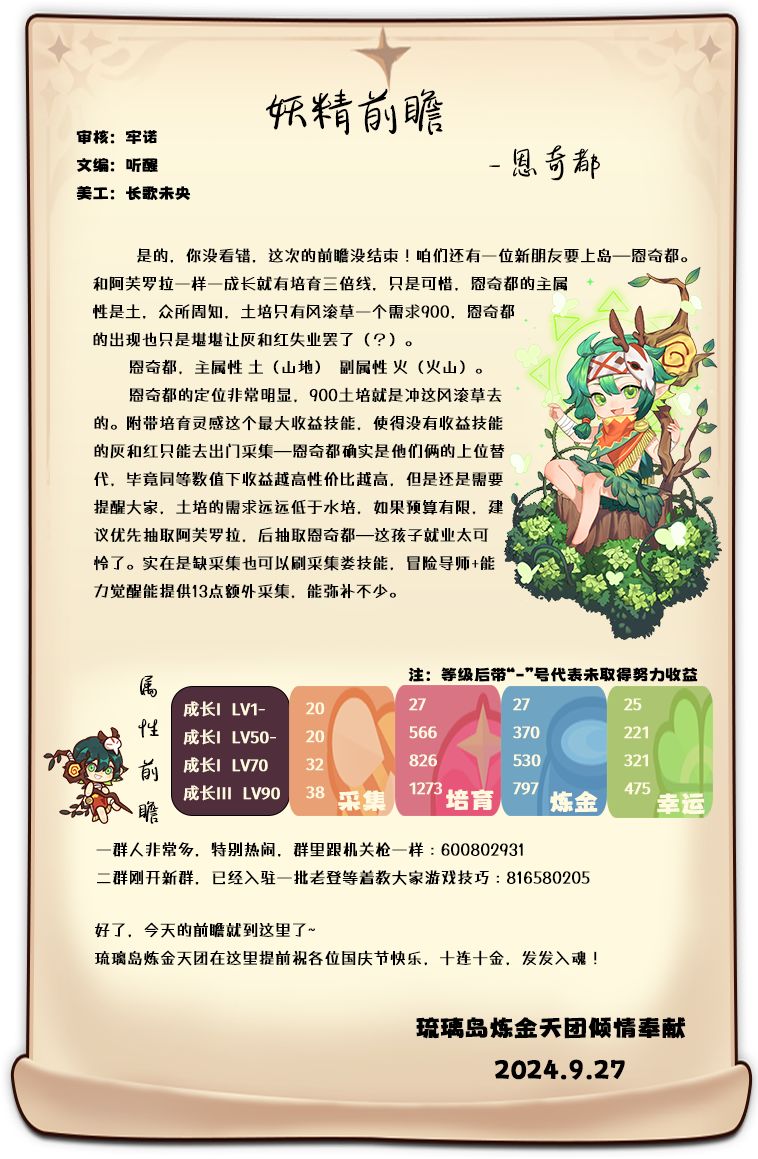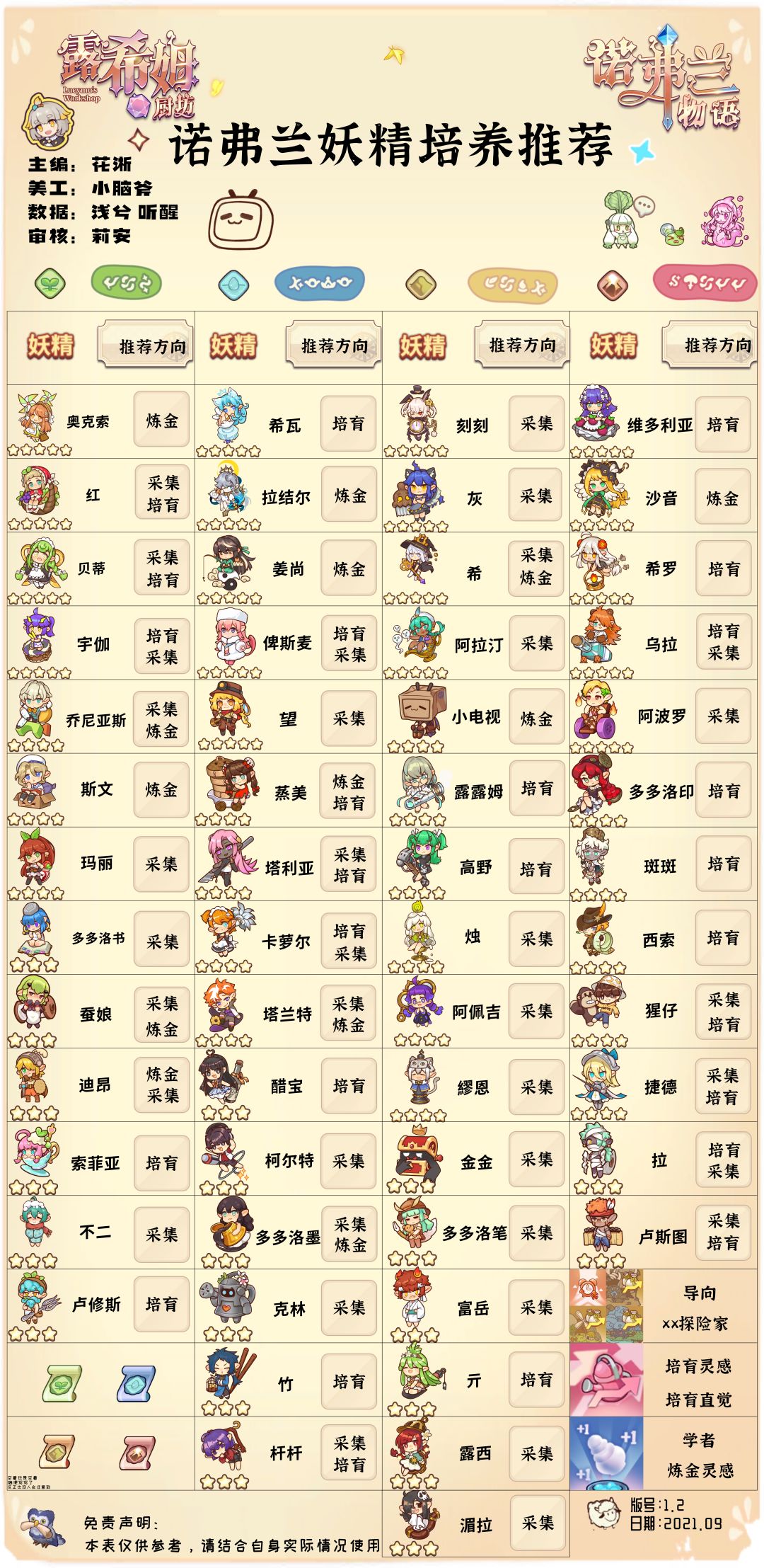 不是攻略!不是攻略!不是攻略! 秘方0加成秒金论坛已经有人整理了 —— *表格内包含除 最新pass安妮 外的全角色 (因为我没买,不想氪金了) (新增培育奥克索、培育杰克、采集湄拉) 图一为总览 图二到五分别为采集、培育、炼金、幸运 图六前世的秘方秒金,图源论坛,有误差 图七npc好感礼物,图源论坛,解锁配方后手帐就直接记录了 (加*号的为非该擅长方向的妖精,但数值并不逊色,除了艾尔文999让我