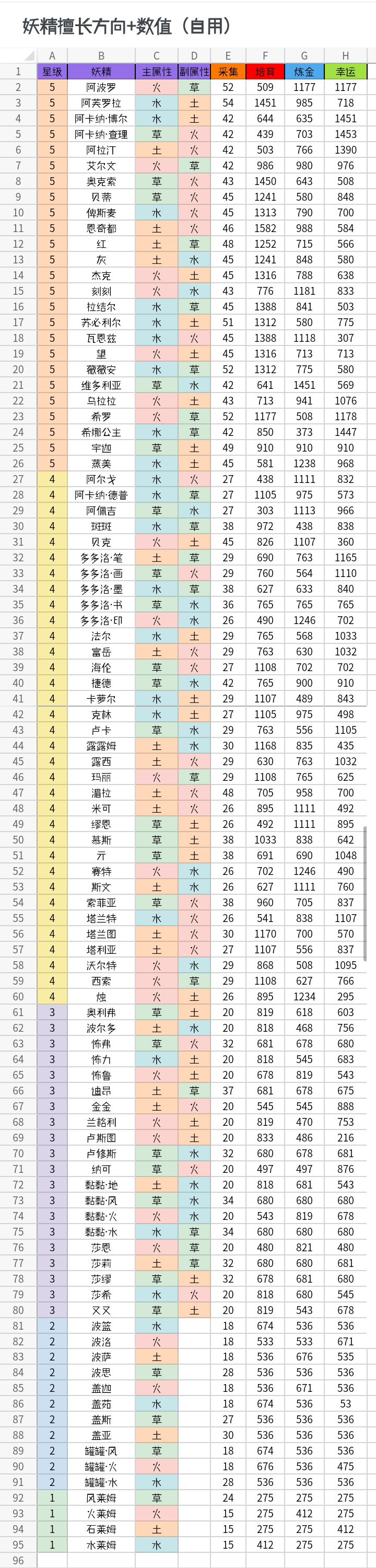 本文主要参考了如下文章, 链接: 也综合了各位玩家的各种攻略,基本弄清了游戏的原理,加上自我理解而写成的。 文章中不给详细统计数据解释,很多都是使用上述链接的结论。 文章只讨论如何选妖精,选妖精的原则,不会涉及太多其他方面。 文章比较硬核,看懂需要动脑筋,下面开始正文。 目录 一、炼金妖精选择 二、培育妖精选择 三、采集妖精选择 四、寻秘妖精选择 上述顺序按照游戏核心内容,优先级依次递减。 一