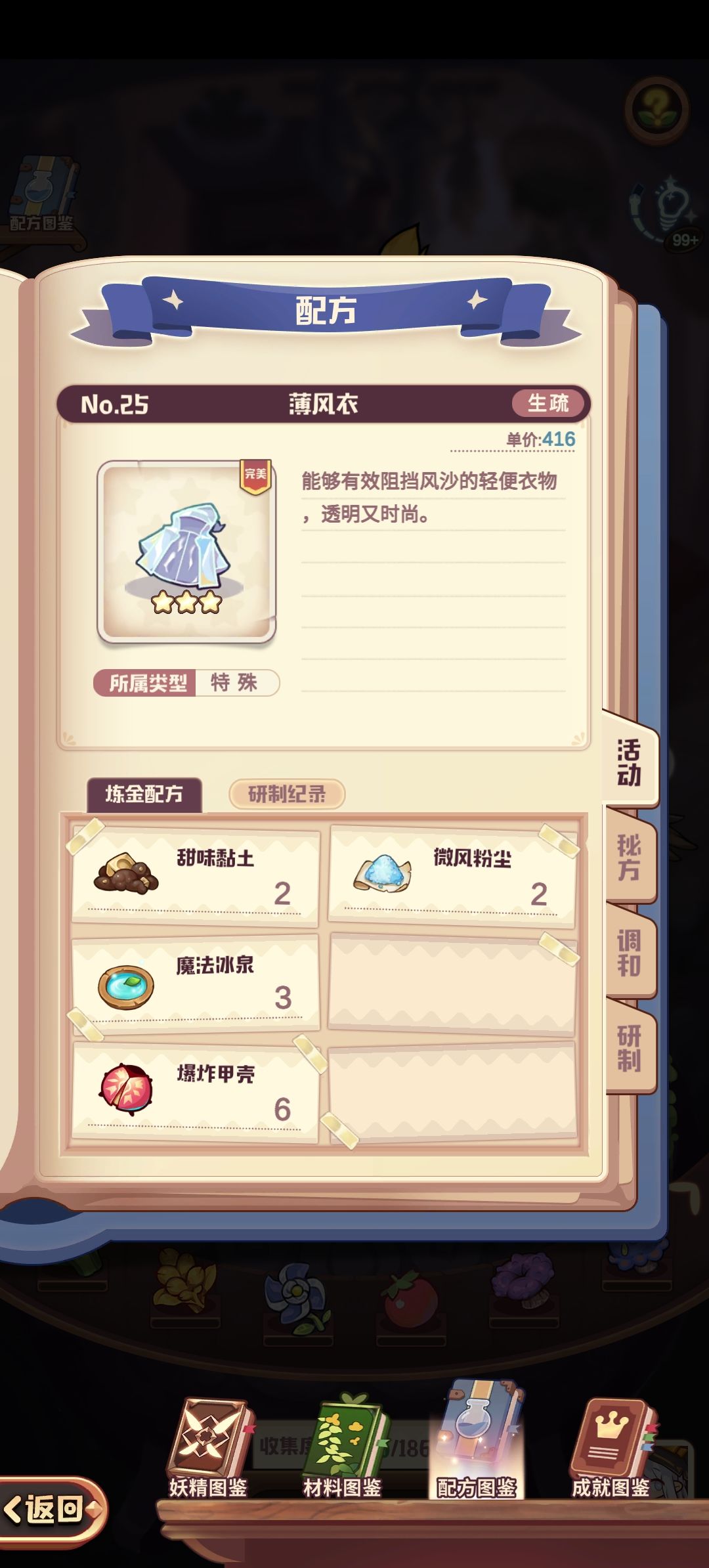 解锁需谨慎,配方材料获取时间长的尽量先不要解锁。活动配方可以用来过主线任务而且不会上委托。 1:植物生长剂: 甜味黏土少量 2:弹力凝胶: 甜味黏土少量、魔法亓草少量 3:超Q弹果冻: 甜味黏土少量、魔法亓草大量 4:番茄酱: 甜味黏土大量,血浆果少量 5:冰沙: 甜味黏土少量、魔法冰泉少量 6:轻灵药: 魔法亓草少量、魔法冰泉少量 7:番茄汤: 血浆果少量、魔法冰泉大量 8:血腥玛丽: 坚硬荆棘