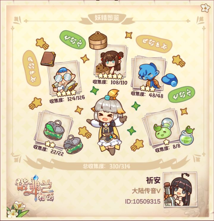 欢迎来到诺弗兰物语! 有感于图鉴的缺失,寻找缺少妖精的不便,我上传了这两篇自制的图鉴攻略。 每个妖精进化前进化后各占一格,图鉴总计五星55、四星63、三星24、二星11、一星4。我差五星1、四星1。根据其他玩家提供的消息,推测195和196为四星杰拉德(漂流瓶),可能为后续某一活动获取。375和376为五星瑞贝卡(小猪储钱罐),忘了是春节还是游戏周年庆时推出,氪金获取。 注:图鉴序号277