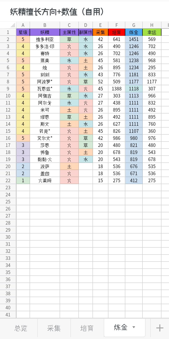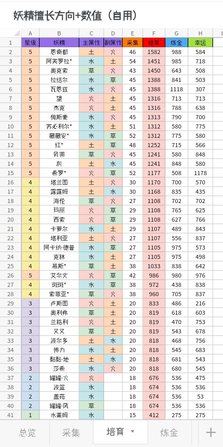 不是攻略!不是攻略!不是攻略!秘方0加成秒金论坛已经有人整理了——*表格内包含除 最新pass安妮 外的全角色(因为我没买,不想氪金了)(新增培育奥克索、培育杰克、采集湄拉)图一为总览图二到五分别为采集、培育、炼金、幸运图六前世的秘方秒金,图源论坛,有误差图七npc好感礼物,图源论坛,解锁配方后手帐就直接记录了(加*号的为非该擅长方向的妖精,但数值并不逊色,除了艾尔文999让我