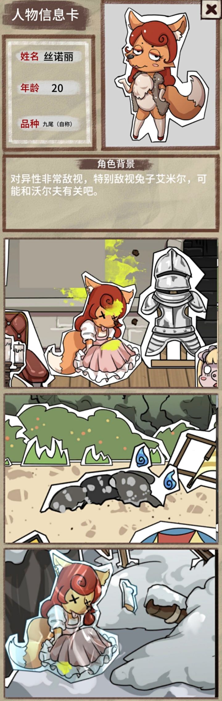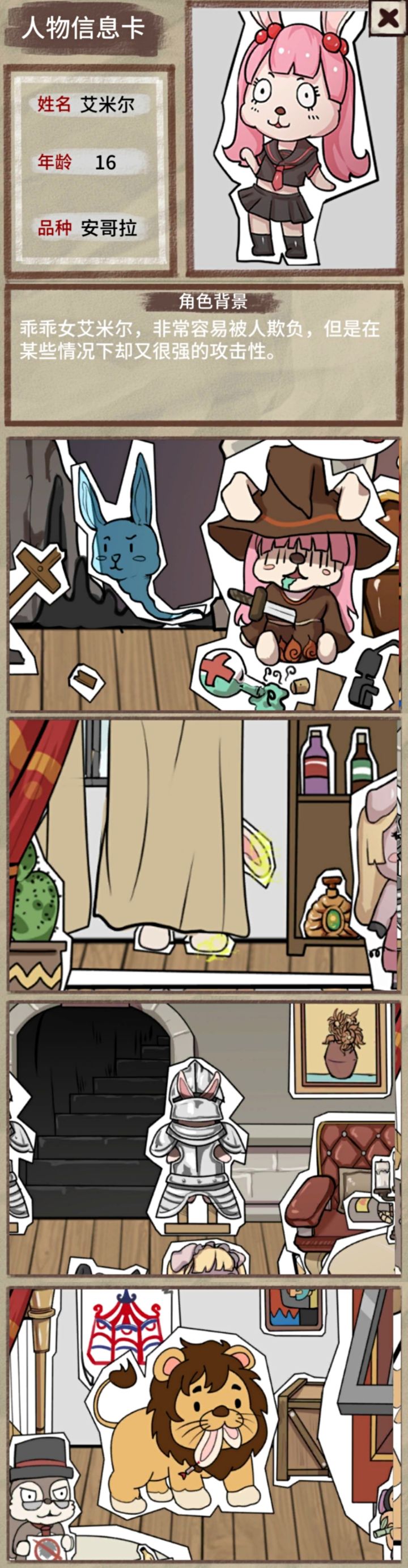 STAGE21.松鼠举着纸片,地上一个牌牌,狮子嘴里兔兔,兔耳上有针,狐狸拿着钥匙。