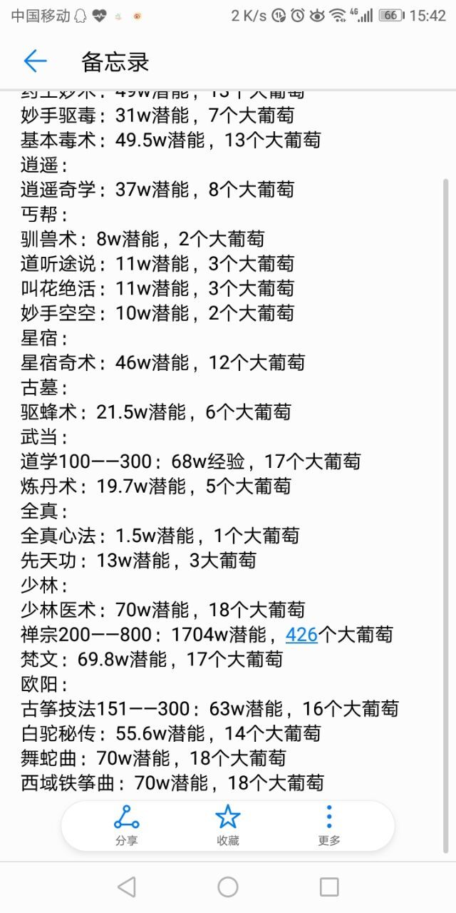 留学各门派所需要潜能各有所不同,主要的潜能大户还是桃花的算数八卦,少林的禅宗心法,武当/全真的道学。还有其他零零砸砸,所需各不相同,这里附上一份比较全的悟性号(37)留学各门派的潜能消耗。(标准数值内有偏差,同时表格没有概括到全部。)