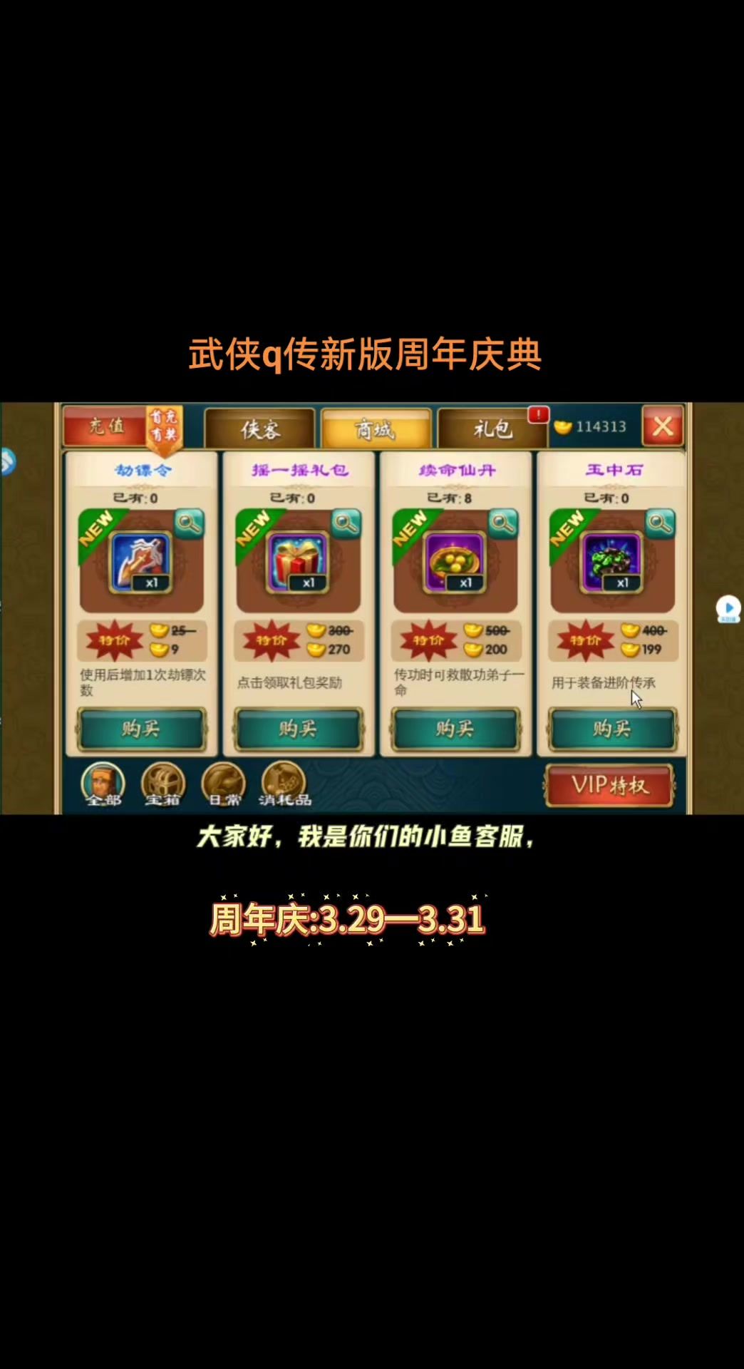 温馨提示各位少侠: 🌈《武侠Q传》新版喜迎一周年庆典 🌈周年庆特别“消费活动”已开启 👏欢迎各位玩家朋友积极参与 #游戏日常 #武侠Q传#卡牌手游