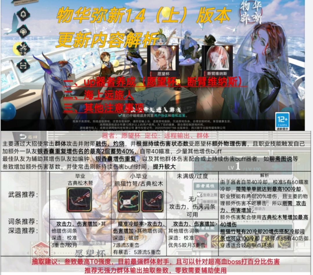 一、up器者养成(图一) 叁致愿望杯补致知最佳选择,零致愿望杯开始不推荐,无法叁致不如等下版本周年庆器者叁致 刚玩不久的萌新可以抽一个洛神赋图,最强奶妈 新红 鹿王本生图机制太毒,基本刚需洛神等奶妈器者,暖机长机制一般,强度党不推荐抽取 二、活动绘影寻迹 关卡简单,资源相比其他版本多了一点点,需要留体力刷关卡代币拿奖励 背景图的鹿有商店,每天刷新可以看成另一个打折易物所,酌情换取 三、其他 1.一