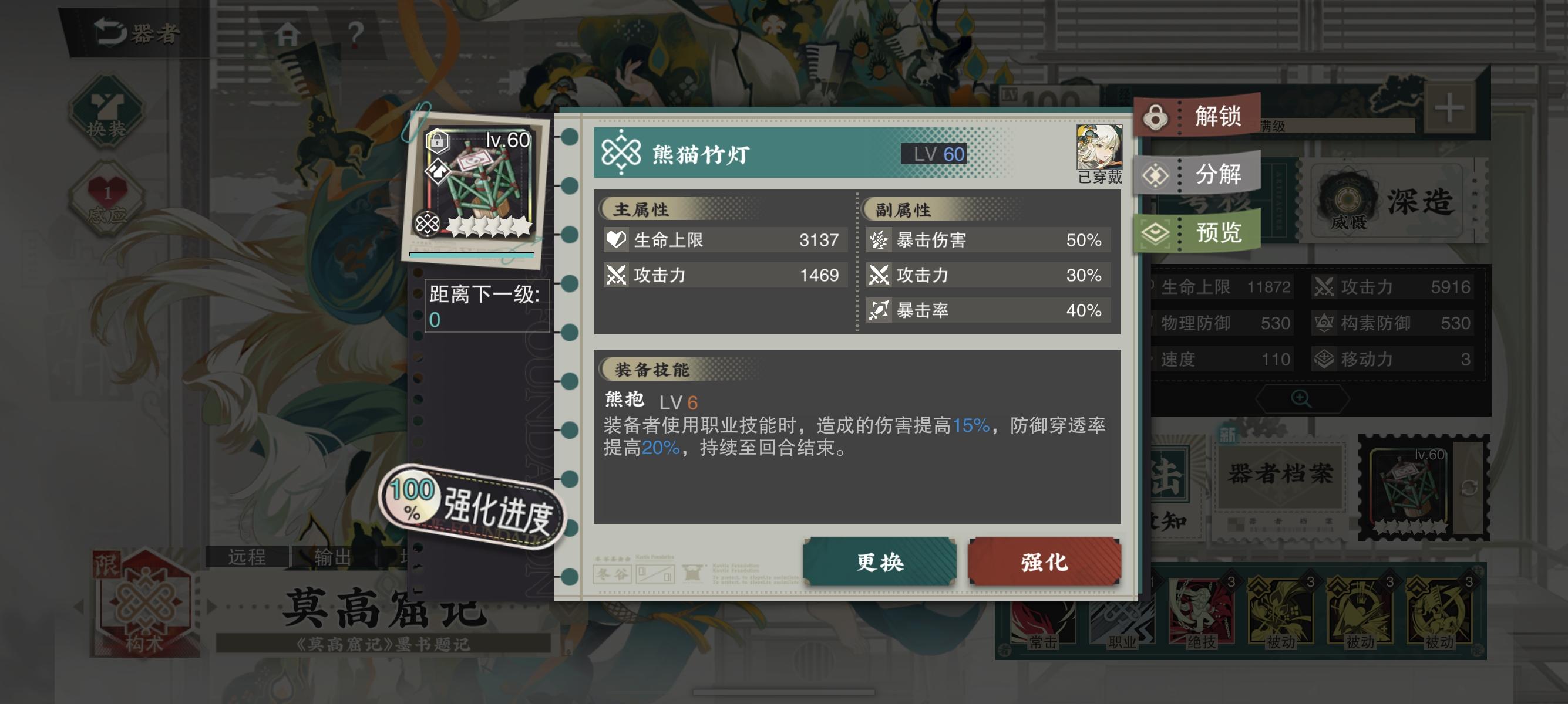 莫高窟记一图流养成 定位:构术辅c 武器:熊猫竹灯 词条:双爆,构术伤害提升等 深造:威慑7300 抽取建议:保底一致知(限定的返场目前谁都不知道,不建议跳过),低氪三致知,高氪六致知 配队:与酒帐无疑是最适配的。此外,可以和220,秦公镈,万工轿等等搭配。#物华弥新 #物华弥新攻略征集 #物华弥新创作者激励计划