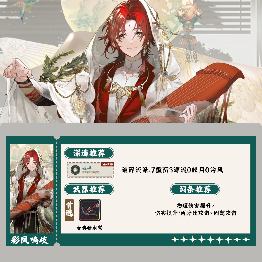 打的活动。 武器推荐:首选珐琅弩,次选抱月弩,其他备选铜犴弩 打输出就正常双爆和增伤词条,深造点破碎。当挂负面工具人可随意。 抱月弩为什么不是首选,因为他的描述是“造成伤害时”。(这点可以参考愿望杯,她的描述是“常击前”。)也就是说如果不是描述有问题就是这样。但他进队后队友可以首选抱月系列。