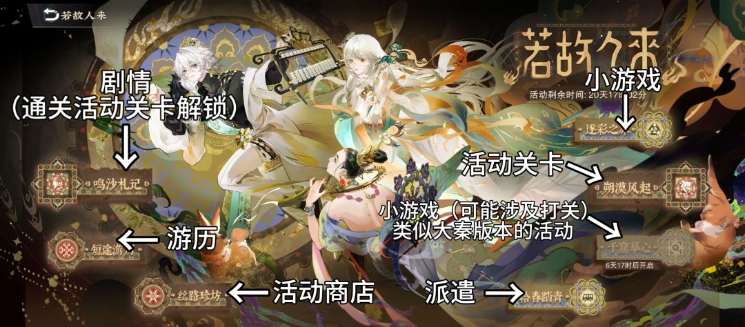 2.0版本上半活动——“若故人来”玩法图解 ⭐活动玩法: ①鸣沙札记(剧情):通关活动关卡→解锁剧情→观看剧情获得灰珀(共240灰珀) ②丝路珍坊(活动道具):扫荡活动关卡可获得活动道具,去活动商店兑换所需物资 ③迷彩之旅(小游戏):通关小游戏可获得灰珀(共6关,每关90灰珀,目前开启1、2关,剩余关卡将陆续开启) ④拾春踏青(派遣):根据要求选择对应的器者队伍出游(要求满足度→地点解锁速度),每