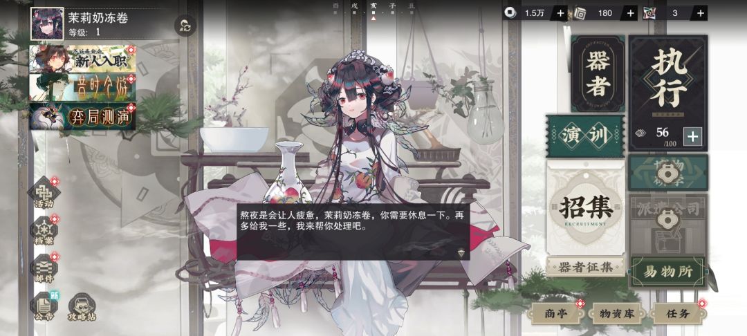首先就是日常进入游戏。 然后先去活动关卡,去刷一些材料,刷十遍。 然后打开派遣公司,点击右下角的收获资源和获取感应。 然后再去办公室点下异物机。 然后就该去和器者们喝茶。 喝完茶之后就该去找狸猫盘的猫猫了。小毛球敲可爱的。 然后去顿舍里领取一下体力。 然后打开器者征集,领取一下昨天的征集结果,再开始今天的征集。 然后点开器者感应点一下。提升一下好感度。 然后再去易物所买一些白材料,一定只买低于1万