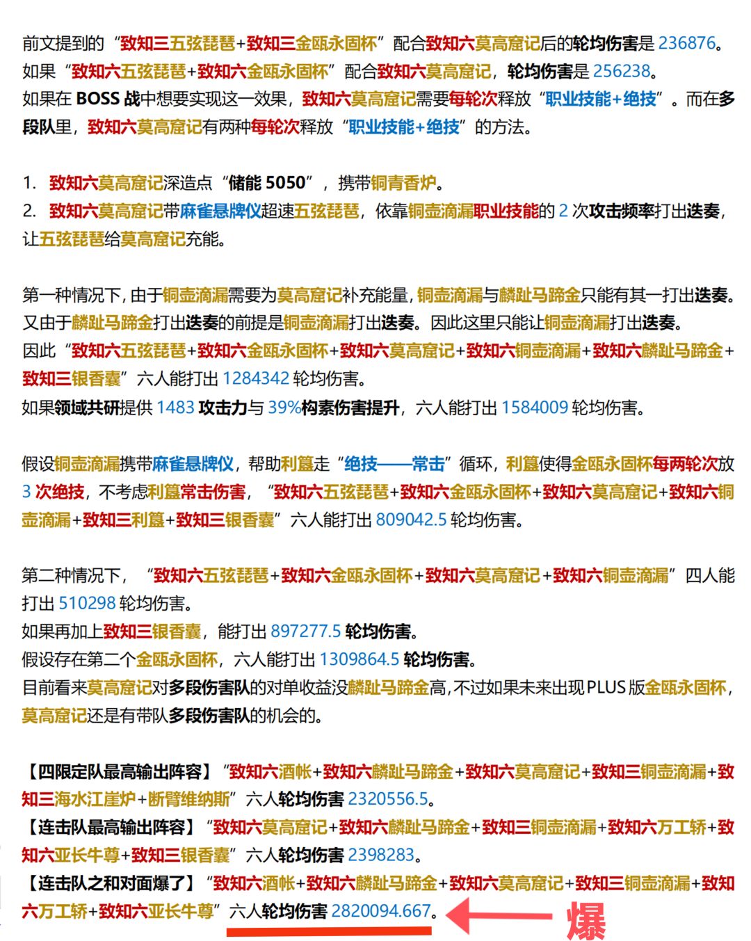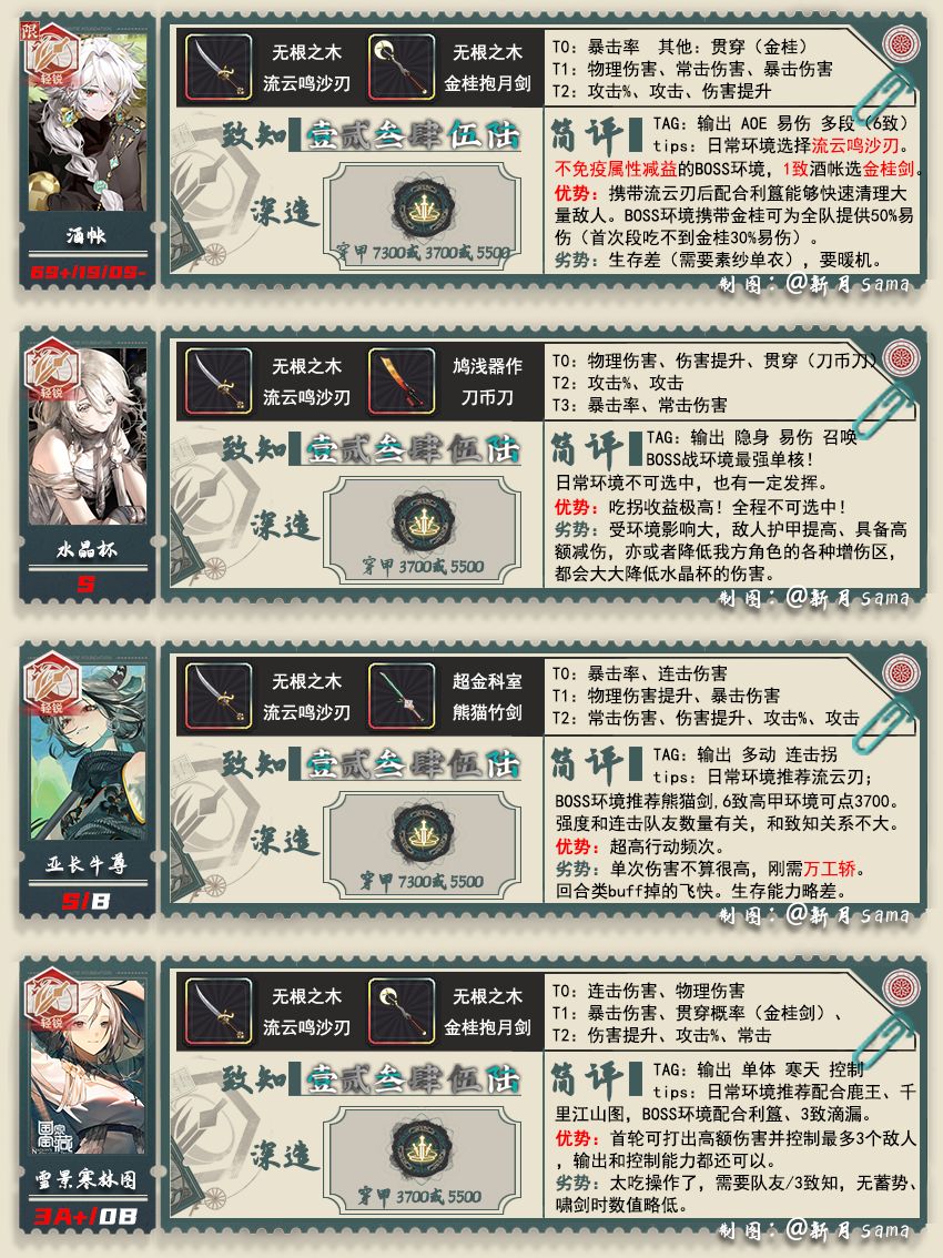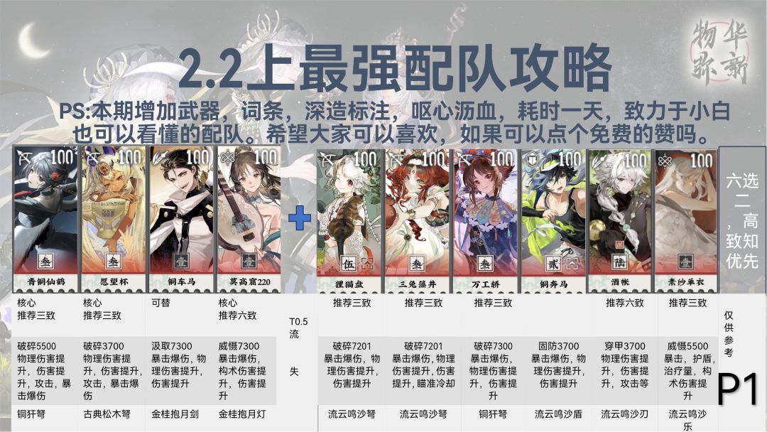 2.2上最强配队攻略 PS:本期增加武器,词条,深造标注,呕心沥血,耗时一天,致力于小白也可以看懂的配队。希望大家可以喜欢,如果可以点个免费的赞吗。 T0连击队 输出良好,顺版本,宝幢加入后生存也有了巨大保障。除了有点费手。 配队角色可以选择近期版本up角色,连击推荐高致知玩家去玩,一回合多动,主打速通。 T0.5低配挂机队 摆烂玩法,输出略微差些,抗伤能力很好,对群为优势区间, 对单较为劣势,高