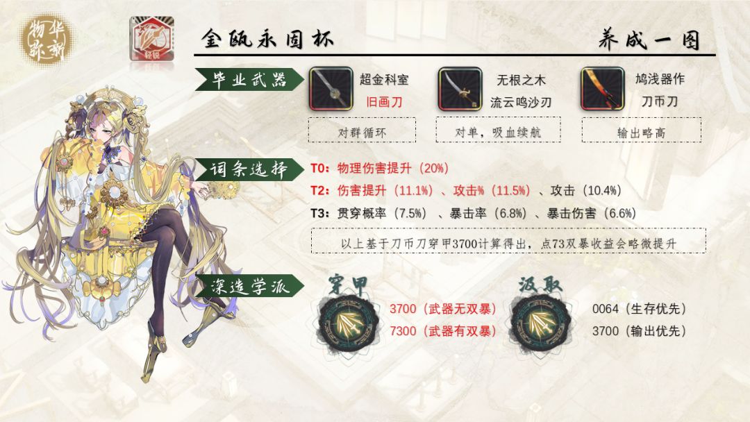 #物华弥新 #物华弥新创作者激励计划 #物华弥新攻略 越王勾践剑 简评:启动速度大幅提升,但数值上几乎无提升。 当作大核玩,可携带流云鸣沙刃搭配滴漏利簋纱衣百花维纳斯 站位分散时也可只带纱衣、利簋组小轴。 强度评价:S-(3致焕彰) 焕彰建议:推荐队友完整,喜欢操作的收藏家焕彰 喜欢自动挂机、缺少队友、没有3致知的情况下均不推荐焕彰 金瓯永固杯 简评:职业技能够回1能,稍微优化循环。 提升了额外