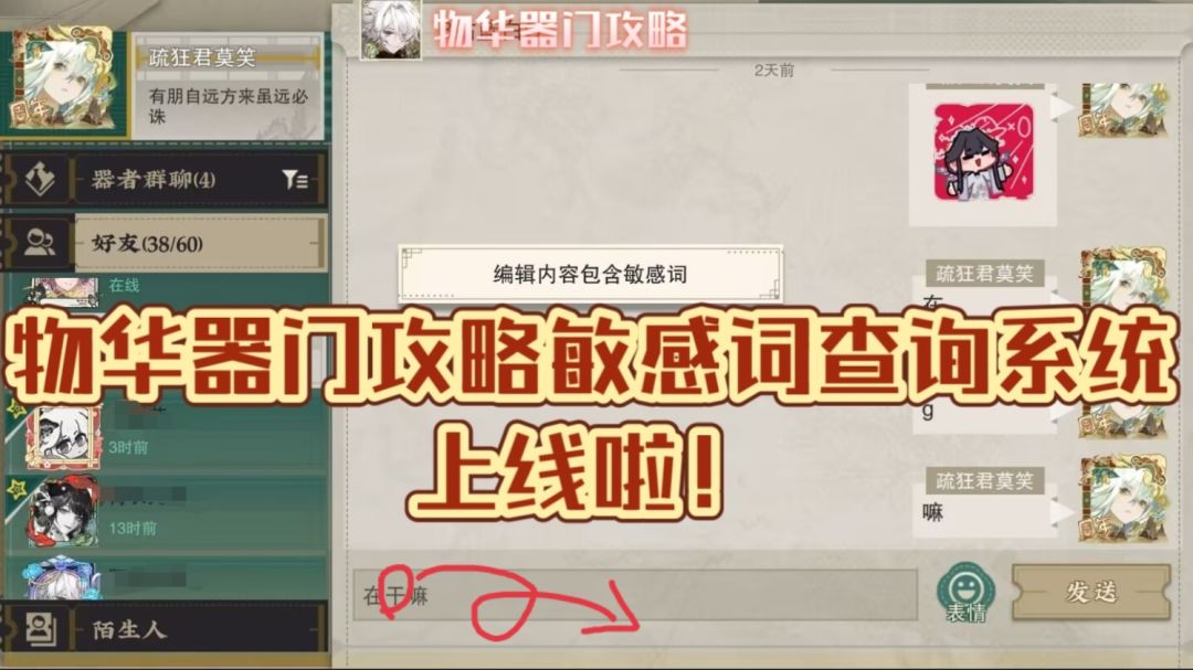 物华超绝敏感肌。 在游戏里面给好友发段话,很容易被显示违规然后发送不出去(如图一所示) 这时候你就可以打开小程序,点击其他(如图二所示) 然后就可以看到这个敏感词检测,点开这个就可以进去了(如图三所示) 然后就会出现这个敏感词检测,在绿色的框框里输入,你要发给你的好友的话,就可以检测出来有没有敏感词,如果有的话,就会显示为红色,如上图所示。这样就不用担心发不出去了#物华弥新 #物华弥新创作者激励计