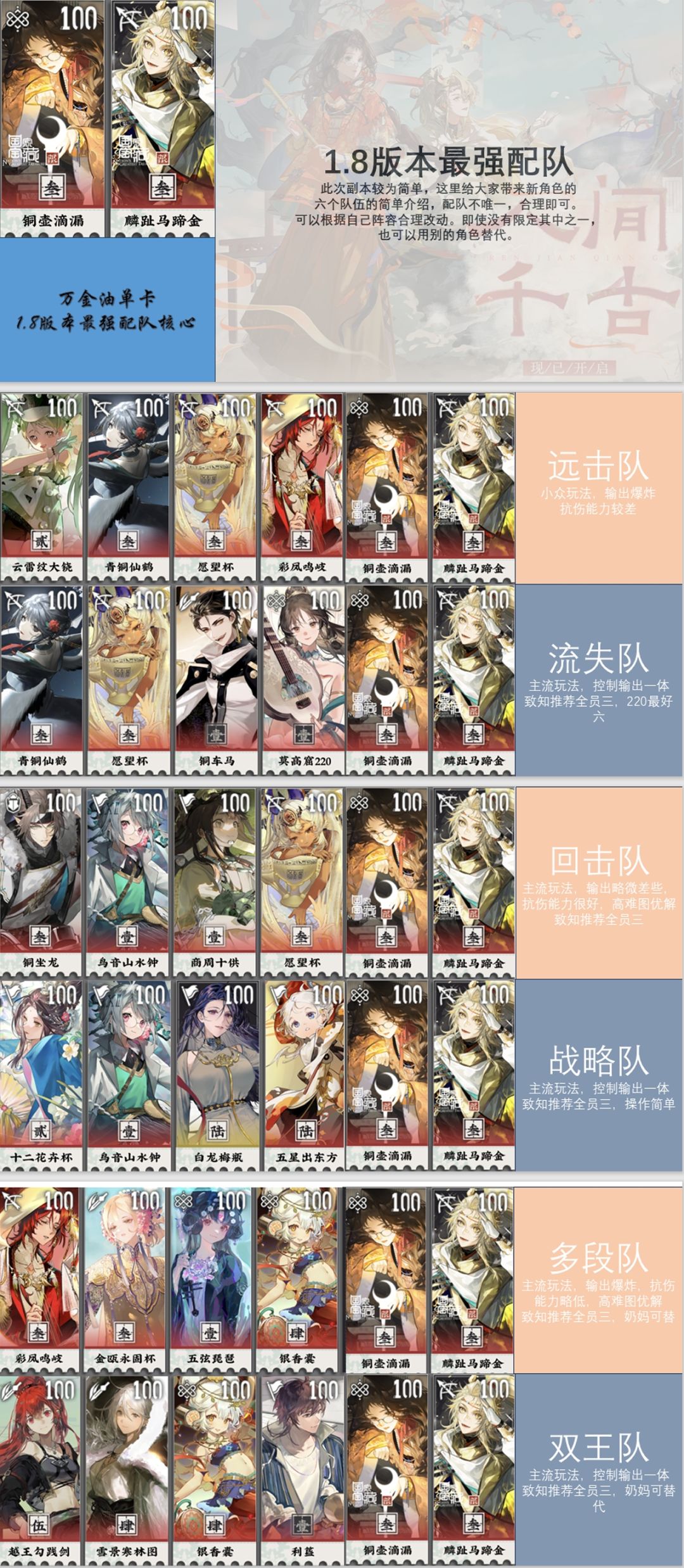 1.8版本最强配队 此次副本较为简单,这里给大家带来新角色的 六个队伍的简单介绍,配队不唯一,合理即可。 可以根据自己阵容合理改动。即使没有限定其中之一 也可以用别的角色替代。 远击队 小众玩法,输出爆炸抗伤能力较差 主流玩法,控制输出一体 流失队 致知推荐全员三,220最好六 回击队 主流玩法,输出略微差些 抗伤能力很好,高难图优解 致知推荐全员三 战略队 主流玩法,控制输出一体 致知推荐全员三