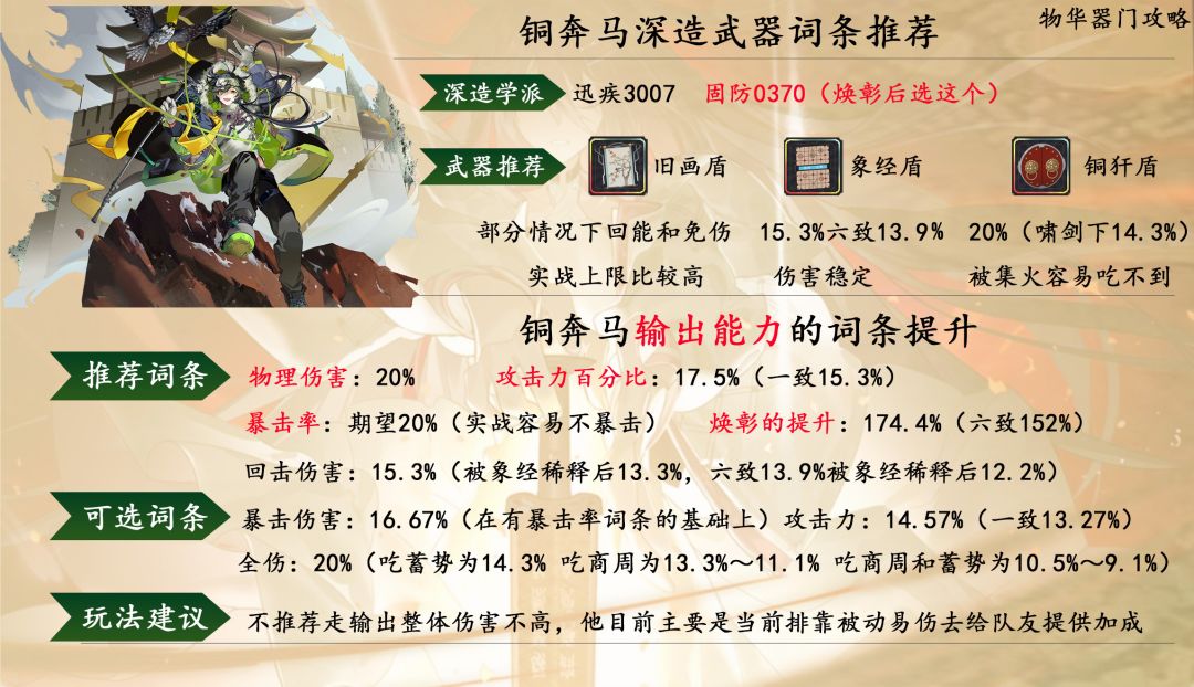 深造方面 焕彰之前选择迅疾3007 焕彰后选择固防0370 词条方面 物理伤害提升最大 其次是暴击率但是实战暴击率容易不暴击 然后就是攻击百分比这3个词条提升最大 焕彰对他的提升很大有174.4%,六致有152% 回击伤害和全伤都被稀释太多了 暴伤要有暴击率词条的情况下才有提升并且不大 攻击力提升比较小 玩法建议 不推荐这样玩因为铜奔马目前最好是去当前排给怪挂易伤提升队友的输出,他自身输出并不高#