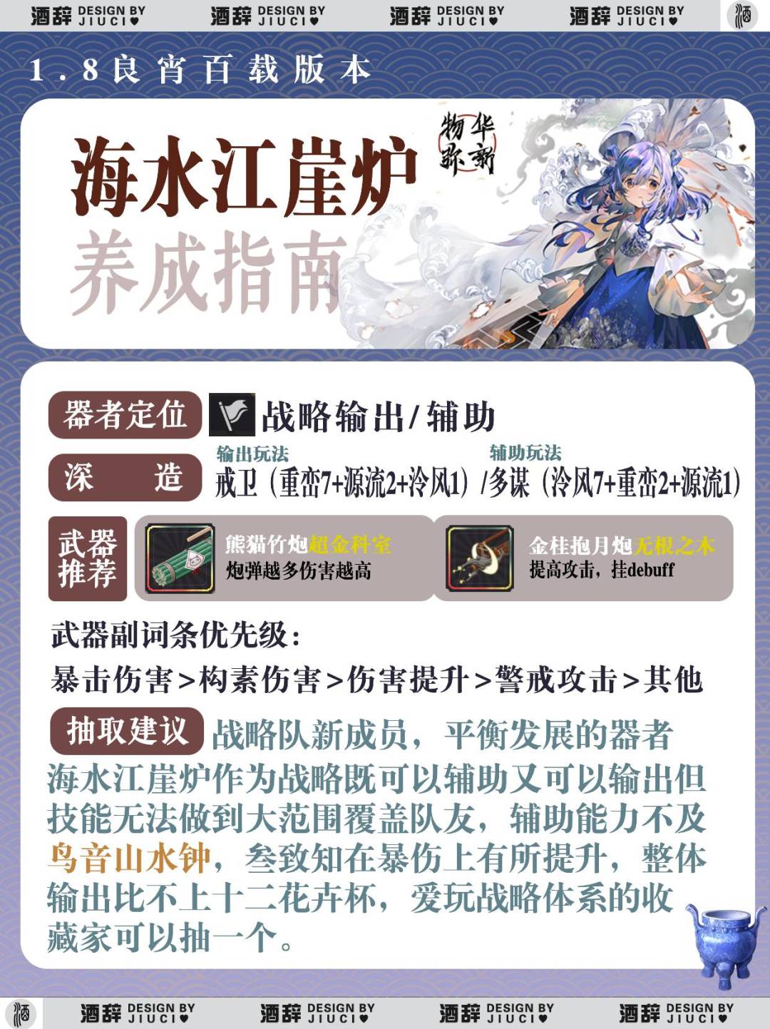 战略是相对适合解放双手的体系 【海水江崖炉】 是一个平衡发展的三好学生 但是无法代替鸟音山水钟和十二花卉杯体系的地位 👉🏻整体算是锦上添花型选手 平时喜欢玩战略队的收藏家可以抽🫴🏻 配队上除了可以和战略队友一起,还可以作为轻锐队友的辅助,为其创造高额输出加成+辅助治疗和驱散效果 尤其是现在很多boss都会给我方挂持续伤害debuff 深造: 以输出为主推荐点戒卫 以辅助为主可以点多谋 #物华弥新创