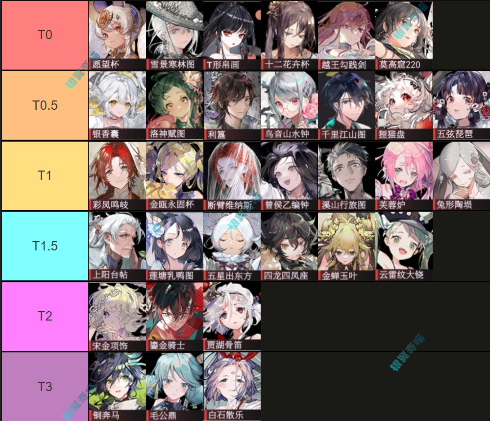 🔷T0: 愿望杯是版本最强远击输出 雪景寒林图相比越王勾践剑启动更快 T型帛画和莫高窟220是两大功能性构术 十二花卉杯是最强点控战略 🔶T0.5: 银香囊和洛神赋图是双强奶 利簋能够加速暖机 鸟音山水钟全能辅助,是战略主核 五弦琵琶队强度提升 千里江山图和狸猫盘在T0.5中偏弱 彩凤鸣岐可以在T0.5或T1(放在T1是因为其自身强度不高,需要搭配队友) 欢迎大家在评论区讨论📣 #物华弥新 #物华