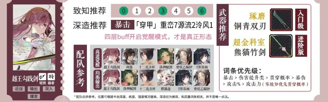 8月1日越王UP 抽取建议:没主C建议抽,0致知勉强T1水平,3致知T0。有三致知雪景、T形这种主C的可以跳(我建议最好有个本体)。 武器:熊猫剑 词条:暴击>伤害提升>贯穿>爆伤 深造:贯穿+暴击 配队:利簋最佳辅助 打法注意事项: 1.没觉醒不能暴击,四层被动觉醒,常击跟连击(触发贯穿)都能叠被动。 2.觉醒加60贯穿率,30%攻击力 3.觉醒后杀人再动,再动减20%攻击力 #物华弥新创作者激