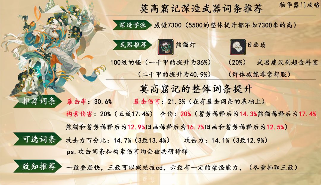 深造方面 只推荐威慑7300,整体的提升都会比5500大,而且他被动杀人可以回能量所以不缺能量,没必要点储能 武器方面 熊猫对他的伤害提升最大毕竟加的是防御穿透,但是他后续加的15全伤也一样会被稀释一些 旧画主要是能群体减能量伤害提升并不大毕竟会被全伤和蓄势稀释 如果想要打输出,就选择熊猫,如果是去当辅助,那建议去选择旧画 词条方面 优先双暴然后是构术伤害,全伤会有一定的稀释 攻击力和攻击百分比会