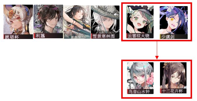 成员介绍: 愿望杯配队的成员如下,因为要实现一回合结束战斗,配队前四人基本不变,后面两人可根据自己的理解和地图进行选择,这里给出了两种方案: 1. 云雷纹+少虡剑(这个需要后面换成一个范围挂流失和割裂的辅助,现在暂时放在这,就是不知道这个辅助要等多久了),也是我心目中愿望杯的最终配队,这个选择优于鸟钟的原因主要是想一回合结束战斗,鸟钟无法再利簋拉条愿望杯的时候加上buff,而3致知利簋和云雷纹完全