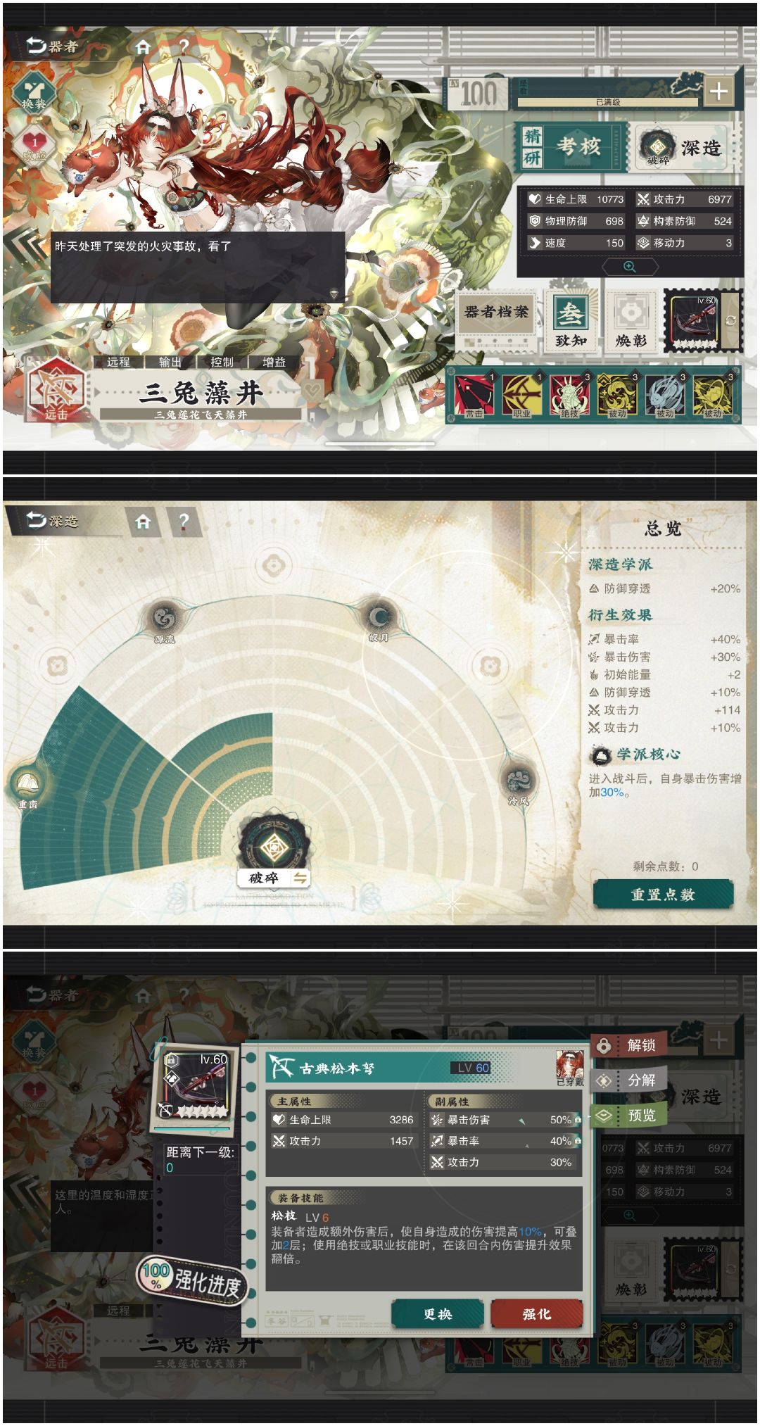 深造加点原因:在实战中,千里江山图需要尽快释放强化后的绝技来输出或者辅助队友,在未强化的情况下释放绝技不仅无法触发任一被动,还会拖慢千里江山图的输出节奏。 因此千里江山图不需要在深造中点出两点初始能量,优先7重峦后2源流获取最大输出收益,剩余的1点能量只能投入皎月与泠风,考虑到1皎月是物理防御加成,因此这里选择1泠风带来的闪避率。#攻略