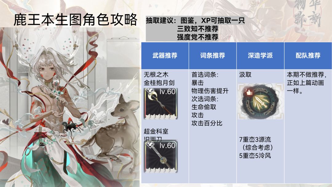 大家好,我是连他的攻略都懒得写的何二维一。今天鹿王也是正式上线了......这位角色应该算是物华弥新自公测后所有新上线的角色中,在上线的当期维一个人感觉最没有存在感的一档了......官方在这个非常敏感的时间点上这么位迷之角色就让人很想不通,其实逻辑上下个版本就是周年庆版本了,按照官方之前的操作逻辑他们一般会上一位较为强力的新角色来消耗大家的资源,不过这次想用鹿王来消耗大家的资源嘛就有点想多了,不
