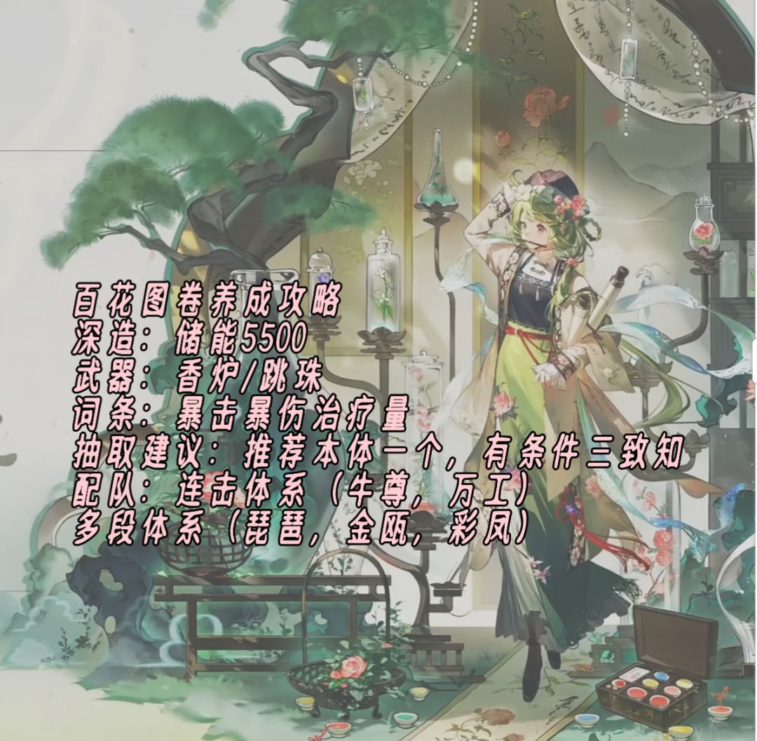 百花图卷养成攻略 深造:储能5500 武器:香炉/跳珠 词条:暴击暴伤治疗量 抽取建议:推荐本体一个,有条件三致知 配队:连击体系(牛尊,万工) 多段体系(琵琶,金瓯,彩凤) 水晶杯养成攻略 深造:穿甲3700 武器:流云鸣沙刃 词条:物理伤害提升,双攻击力,伤害提升 (注意本体打输出较高,没必要追求双攻) 抽取建议:优先百花其次水晶杯,本体即可 配队:召唤流(马蹄金,T型,家具) (注:非捆绑式