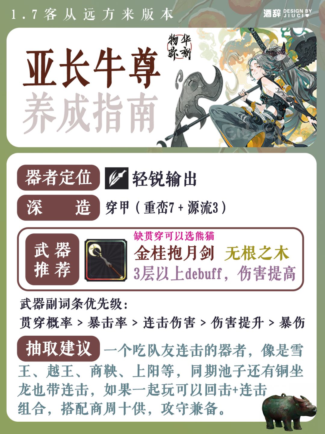 亚长牛尊特色:队友连击再动+挂buff增益 1.7版本新的轻锐来了!增益+输出能力 是你不可错过的一名大C 亚长牛尊最主要的就是绝技浮饮长歌-酣饮状态 且被动「万物有灵」每有一个队友连击一次,牛尊攻击力提高 这决定了牛尊的队友需要带连击技能 雪景寒林图,越王勾践剑,商鞅方升,上阳台帖等器者都具备连击技能 P.S:这次同期up铜座龙也带连击 深造推荐: 【穿甲】重峦7 源流3 缺贯穿可以点重峦5 源
