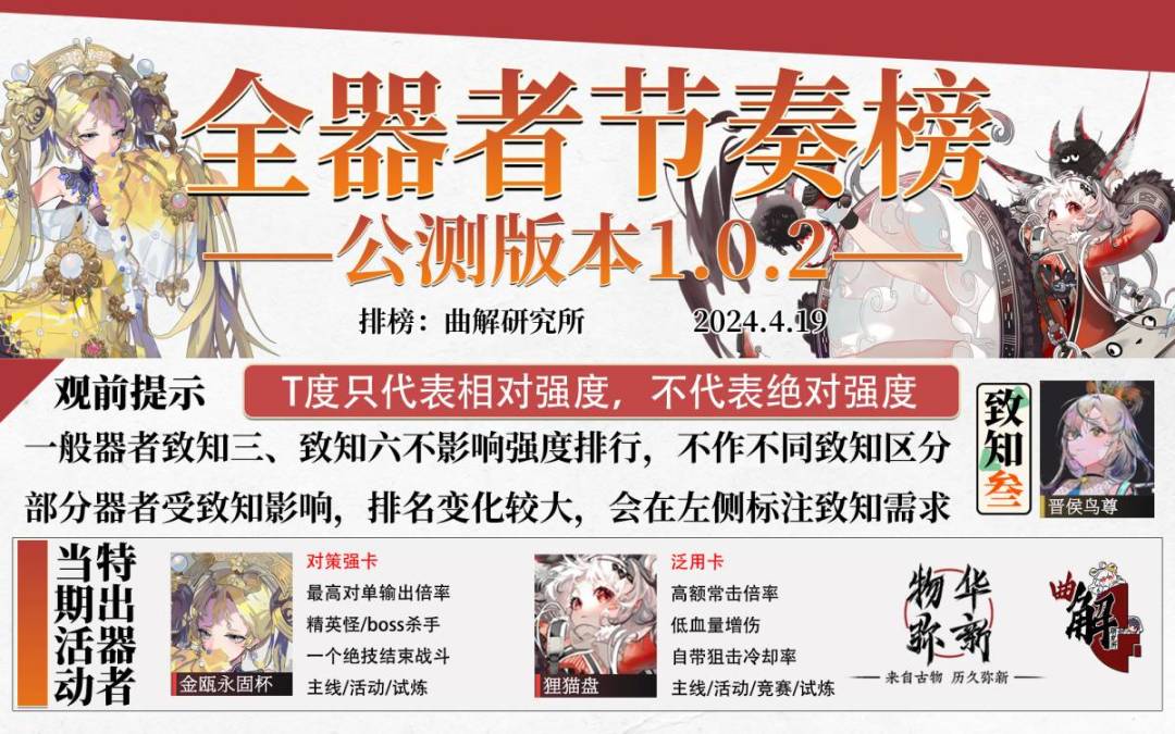 【曲解研究所】出品 物华弥新全器者强度榜 公测版本1.0.2ver 公测版本调整器者 莲塘乳鸭图↗ 铜餐具 ↘ 兔形陶埙 ↘ 五星出东方↘ 利簋 ↘ 金蝉玉叶↘ 茶叶生产画↘ 全红卡实战分析攻略帖见 【物华弥新】全特出(红卡)实战分析攻略 - TapTap https://www.taptap.cn/moment/530359794800790731?share_id=8febd88b54