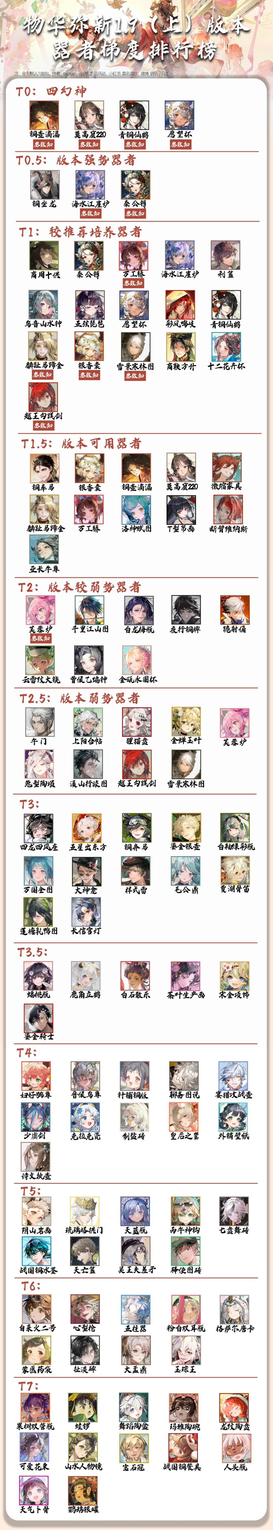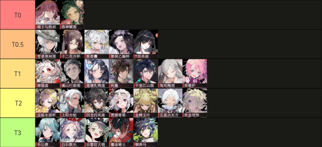 说明:本榜单以主要器者的主要就业情况排名,部分特出器者(红)三致知和零致知强度不同因此会同时上榜,优异器者(金)默认六致知。 T0: 主c:越王勾践剑(三致知) 雪景寒林图(三致知) 愿望杯 愿望杯(三致知) T型帛画(三致知) 控制:十二花卉杯 十二花卉杯(三致知) 辅助:利簋 银香囊 银香囊(三致知) 奶妈:洛神赋图 抗伤:T型帛画 T0.5: 主c:彩凤鸣岐(三致知) 芙蓉炉(三致知) 控