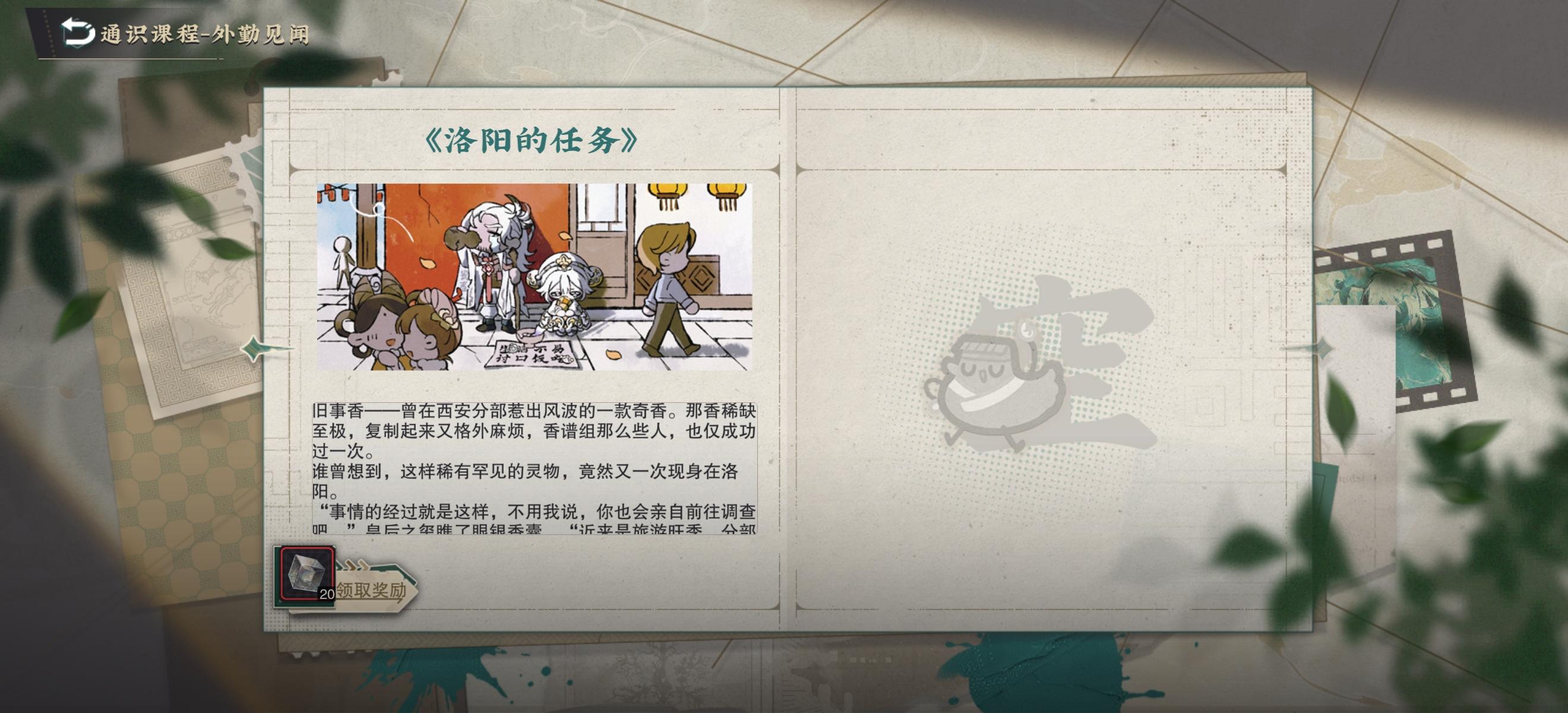 1.21更新后新增见闻两篇,一篇是麟趾马蹄金,另一篇是银香囊的外勤见闻。另外,外勤时长不影响见闻的获取,如果收藏家想尽快拿完所有见闻,可以选择4小时进行外勤,目前一次性最多可以解锁三篇。 要点一览:1.派遣见闻相关器者,目前已有:蝠桃瓶、商鞅方升、彩凤鸣岐、扯淡碑、酒帐、莫高窟记、千里江山图、金瓯永固杯、T型帛画、飞天/莫高窟220、洛神赋图/百花图卷、青铜仙鹤、狸猫盘、海水江崖炉、万工