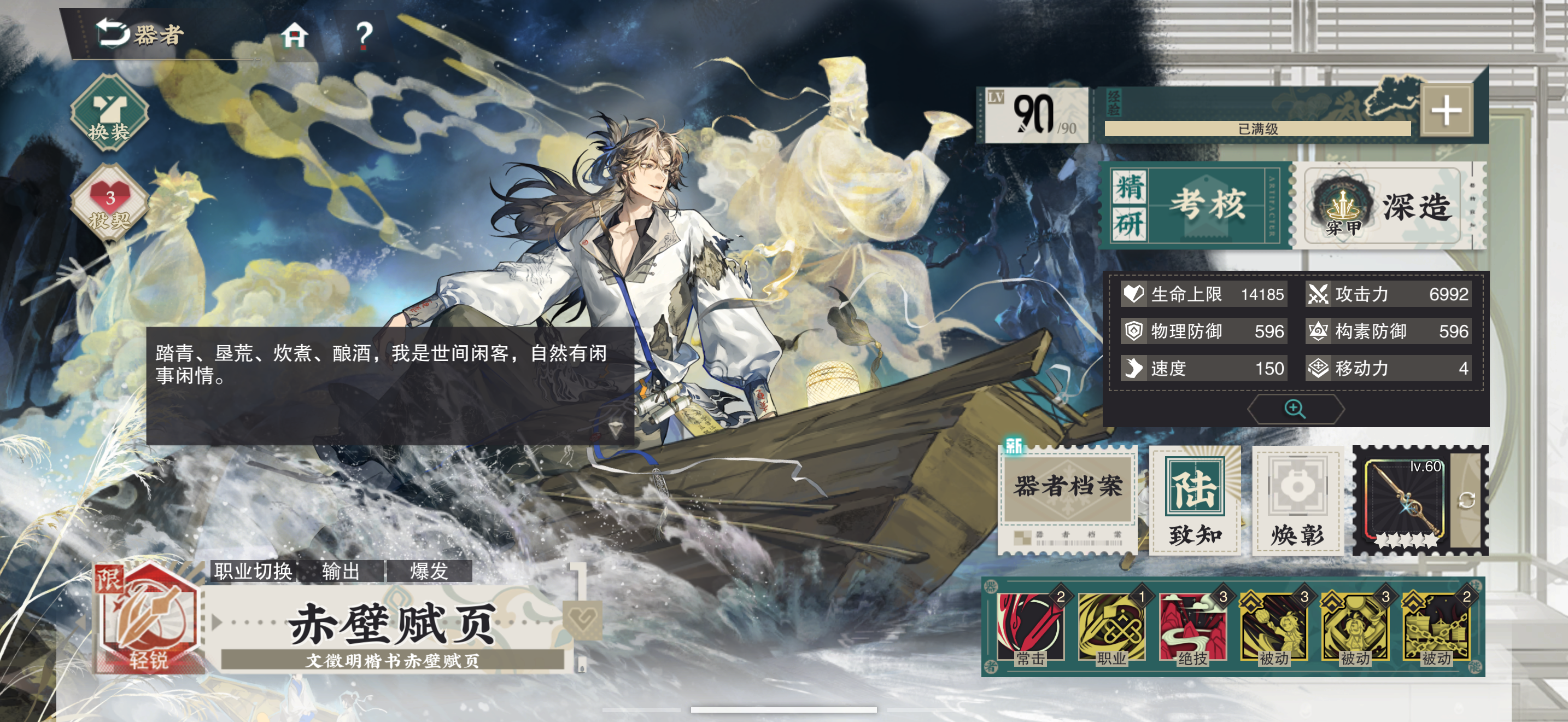物华首位双职业器者即将登场,技能介绍也是写成小作文了,我给大家总结一下赤壁赋是轻锐构术双职业,两个形态两套技能,就且分开看①轻锐形态普攻:单体物伤技能:切换为构术形态,获得减移动的额外行动绝技:单体法伤,附加可暴击的额外物伤被动一:绝技使受击单位降低防御力,贯穿越高,降防越多被动二:常驻爆率提升,由构术切换到轻锐后,获得一个buff(提升移动力,常击回能,获得只能用绝技的再行动)被