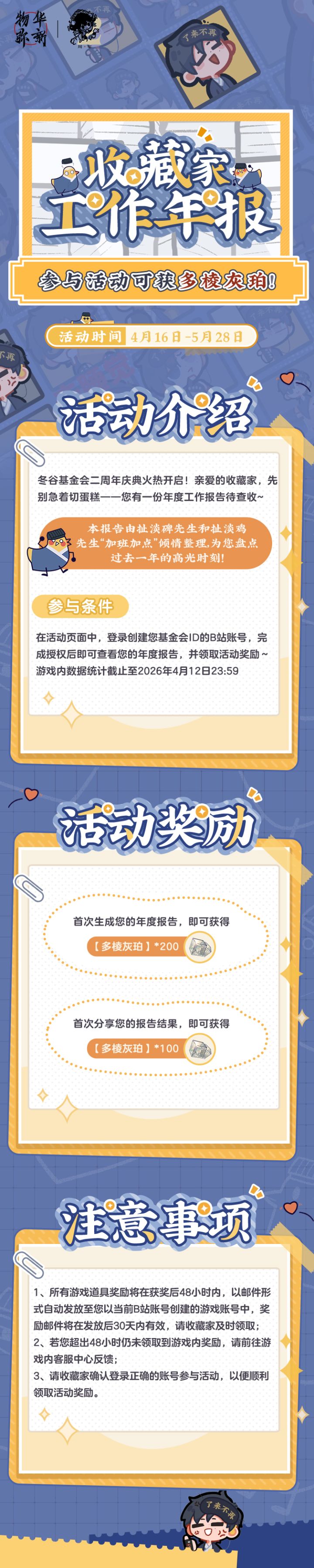 冬谷基金会二周年庆典火热开启!亲爱的收藏家,先别急着切蛋糕——您有一份年度工作报告待查收~《物华弥新》「收藏家工作年报」活动现已正式开启!欢迎各位收藏家前往参与~✦活动时间✦活动开始:2026年4月16日活动截止:2026年5月28日✦活动链接✦✦活动奖励✦首次生成及分享年度报告,即可获得多棱灰珀好礼!更多活动详情与活动规则,收藏家们请前往页面查看!