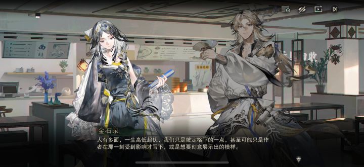 最初观看金石录PV时,我就隐隐有预感:我应该会相当喜欢这次剧情,喜欢金石录。当时只道是“纸笔无言,载此生大梦一场”令我心中不由酸胀,有所感触而潸然泪下,却不知究竟为何共鸣,于是既期待又不安,盼的是一探新剧情究竟,又恐其不过尔尔。然而在下班后第一时间品读完新剧情的我,不仅前些日子对华子的颇有微词烟消云散,而且心中徒然升起对本次剧情文案的敬意。此前抱有二游更偏向男性受众的刻板印象,也