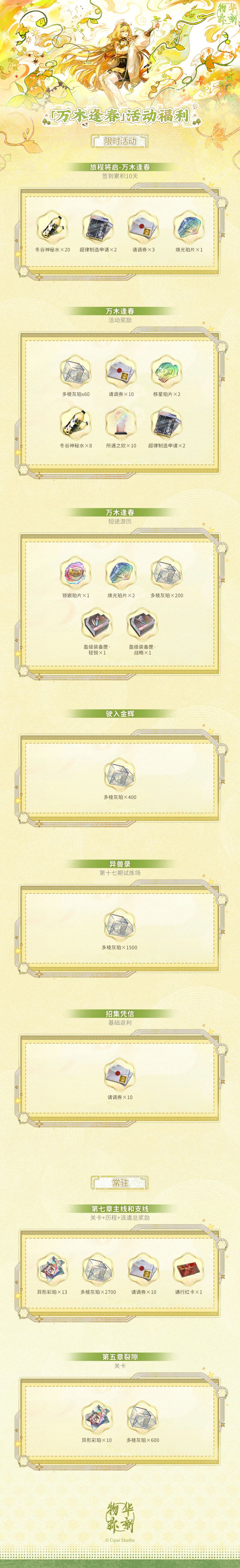「万木逢春」版本即将开启,本次版本活动可获取的奖励如图所示。版本开启后,第七章主线和支线及第五章裂隙相关关卡将常驻开放,详情请点击长图查看~