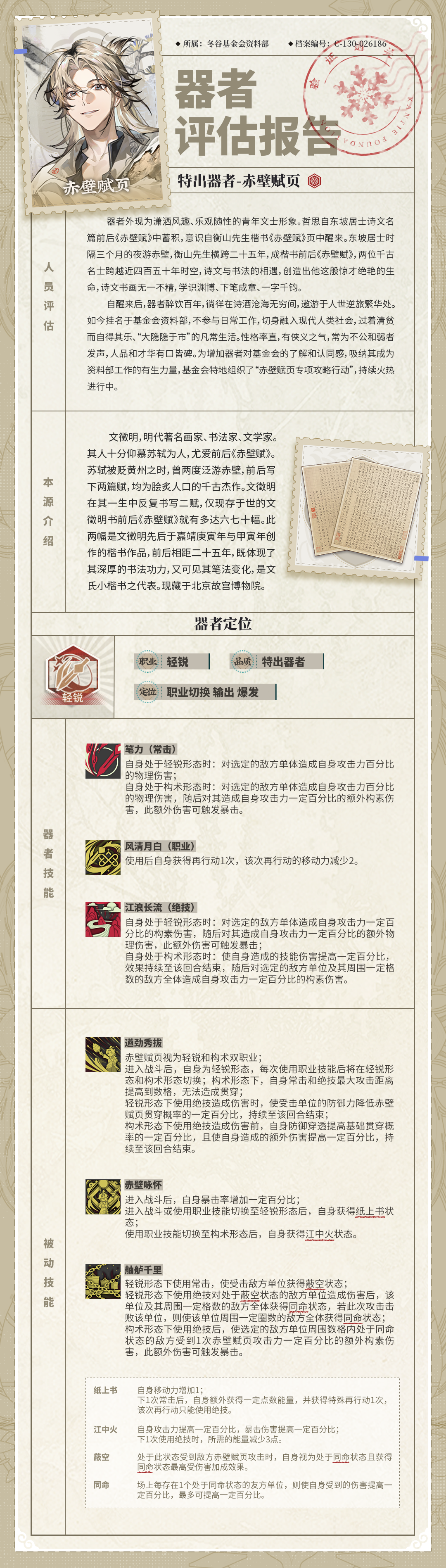 我将秉持着零知就能用的原则进行红卡推荐,并在后面进行相应的解释,主要是给新手们整体的一个养成方向。帖子制作不易,若有遗漏的地方,欢迎大家在评论区指正。新手向帖子,只考虑前期,不考虑幻彰!因为新玩家是没有资源幻彰的。A:构数构数输出型器者————————————1:王氏书翰卷(能用!当个蓄势哮剑拐挺不错的,就业面也比较广。但刚需队友解决速度问题)2:T型帛画(能用!刚需三知才能独挡一路。三
