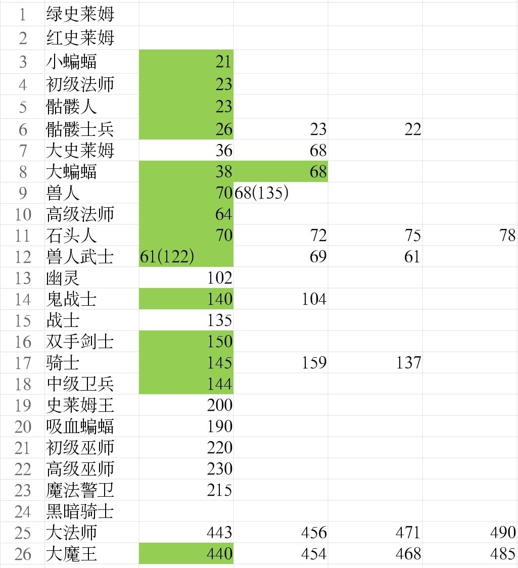 一区: 角色初始属性: 攻击10 防御10 小怪属性: 绿色史莱姆: 临界防御18 临界攻击13 19 36 红色史莱姆: 临界防御20 临界攻击11 14 17 25 47 小蝙蝠: 临界防御38 临界攻击21 38 初级法师: 临界防御32 临界攻击20 23 28 38 68 骷髅人: 临界防御42 临界攻击 23 31 56 骷髅士兵: 临界防御52 临界攻击23 26 31 40 67 小