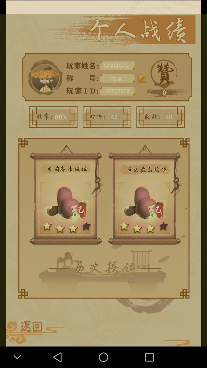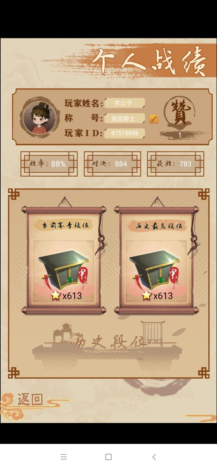 两个号都上御史大夫了这游戏bug挺多的我赞同,有时候进不去我也知道。官方群:255866371有问题可以进群问,可以反馈,能不能不要直接刷一星?我觉得小公司做这种游戏真的很难,大家能不能理解一下?还有匹配有机器人的问题,我就想问:一共20个御史,其中还有我小号,我要是打排位想凑齐这六个人是不是要等其他人上线?那这个游戏还有什么体验吗?现在玩家少,有机器人很正常,毕竟你也不想刚玩一个游戏进去先