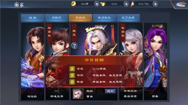 各位主公大家好,之前给大家介绍了《百将录》中的国家系统,但是其中一个主要的系统没有讲,那么小编今天就来给大家详细的介绍一下~~军机处~大家一起看下吧~军机处:军机处,每天刷新前国王信息以及前思君团的军团长信息,系统会自动宣战,当NPC灭亡后,国王和军团长可点击非NPC进行宣战和进行攻城;国王的权限大于军团长哦,国王未宣战,宣战时间到期后,自动宣战军团长获取最多城池。大家是不是以为这种就没有了呢