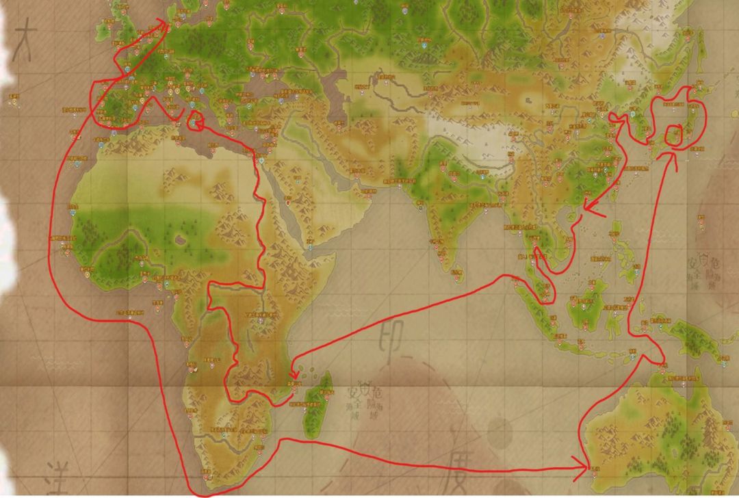 全球远洋跑商攻略 线路图如上 亚洲——东南亚——地中海——欧洲——非洲——东南亚——亚洲 起点终点均为东京 可以无限循环 没有重复路程且经过全球 基于此游戏跑商货物刷新时间为0.5小时-1.5小时不等,因此单纯的小商圈往往会出现断货少货的现象影响效率,本线路由数个跑商小圈组成利润效率目前个人感觉最高 原理是在进行各小圈跑商时搜集长途货物跨州买卖 长途货即是跨大洲 时间长,载重少,利润高的物品包括