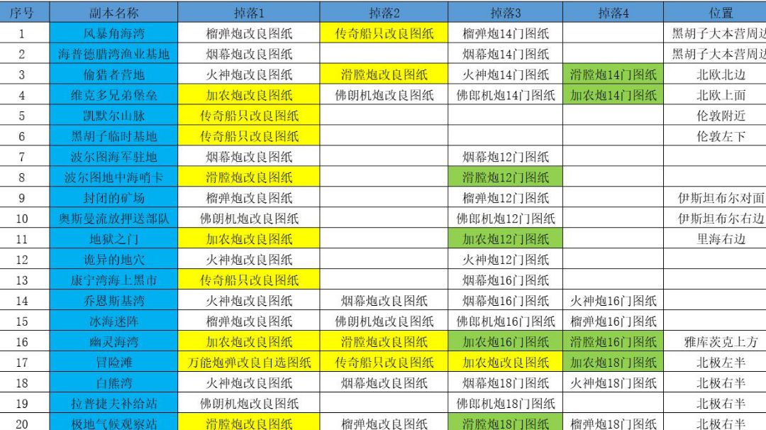 南极三海本 地狱之门 波尔多地中海哨卡 维克多兄弟堡垒 偷猎者营地 幽灵海湾 冒险滩 极地气候观察站 凯末尔山脉 黑胡子临时基地 风暴角海湾 康宁湾海上黑市 (不冻港,埃夏山蓝冰湖,阿巴坎汉宫遗址外围)只有炮图且有替代副本,缺了再打 8门和10门炮图副本我没打,因为跑黑市比打副本出的数量多多了,要是有多余的采买证就更快了 想休闲的等12炮图纸数量攒够了,地狱之门和哨卡这两个麻烦的副本就不用打了,因