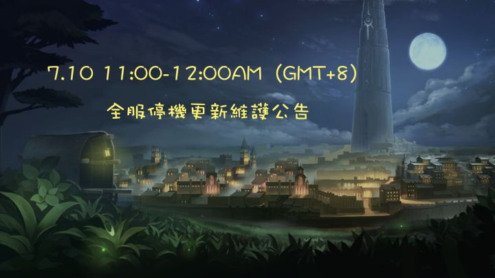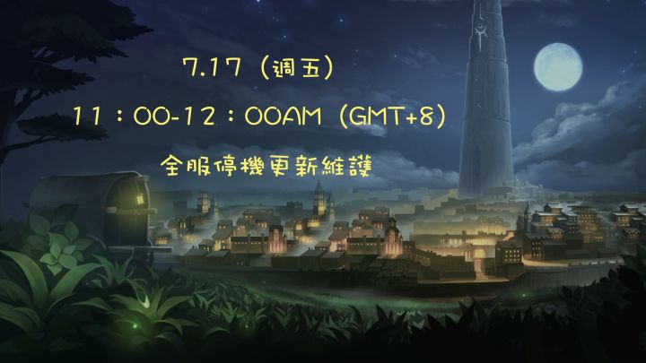 爲提供更好的遊戲體驗和更加穩定的遊戲環境,我們將於7月17日11:00-12:00AM (GMT+8)對全服進行停機維護,預計時長1小時。