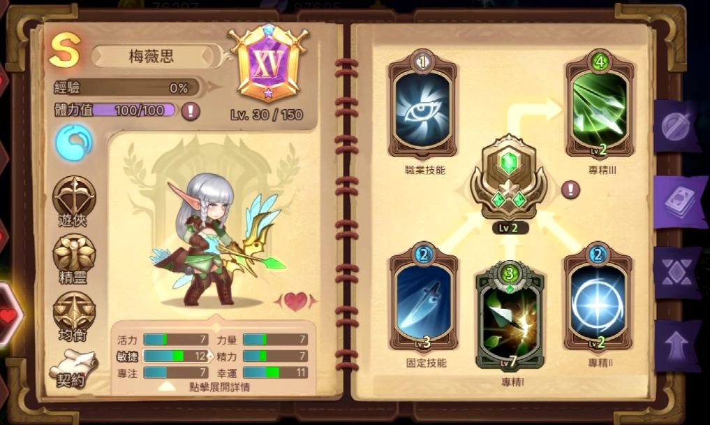 神射手/鄉村醫生/攀岩高手/叢林導遊......沒錯,這些都是同一個人,她就是斜杠青年遊俠 XD常年遊蕩在各種魔物出沒的幽暗密林,身手敏捷,上能爬樹攀岩,下能自在潛行於矮木叢,受傷了也能自己醫治,集各種技能於一身,簡直不要太厲害,難怪口氣這麼大。旋轉跳躍我閉著眼,敵人紛紛中箭,都消失不見~職業簡介職業初始技能(三選一)射手直覺包紮 凝視水系精靈遊俠 遊俠單體爆發傷害極高,一招斃命