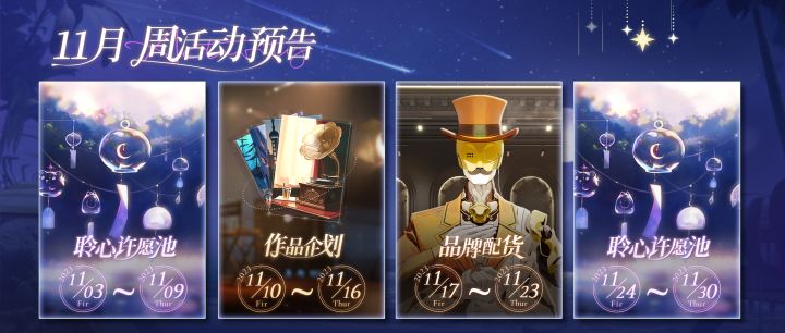 号外号外!勤奋工作的斑斑给大家带来了11月限定周的轮替安排,各位艺人大大请看:聆心许愿池:11月3日——11月9日;11月24日——11月30日作品企划:11月10日——11月16日品牌配货:11月17日——11月23日本周五【聆心许愿池】的限定周轮替即将开启,斑斑提醒各位艺人大大要合理规划道具的使用哦!祝各位艺人大大欧气满满!