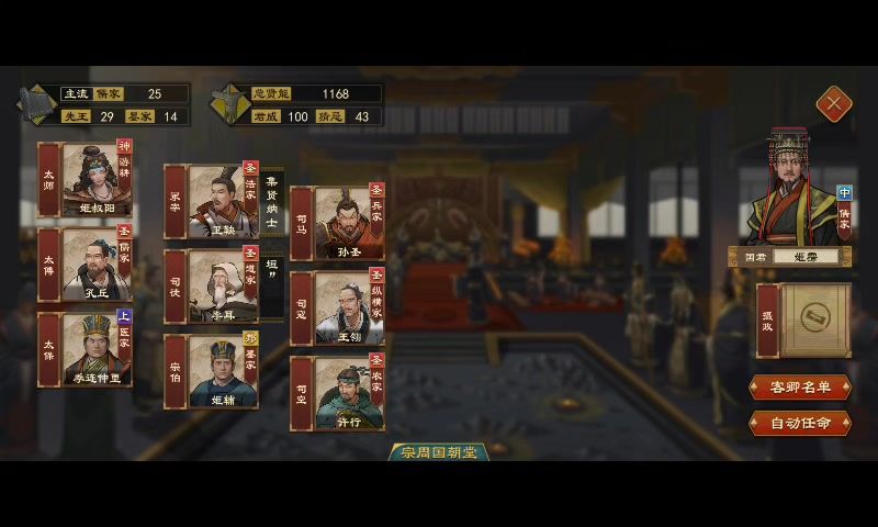 所带圣人,没特殊要求,最好老子,孙武,商鞅(管仲) 能力按需求而带。 流派儒家。 进入游戏第一件事,任命圣人为朝臣,然后赐给其宗女(后续有大用),接着过一年进入闾里,点开相应官职,看看其有没有儿子,有的话进入朝堂赏赐拜卿,没有的话可以花君威在其公府里面立家。 成立卿室后,重点来了,公卿在早版本是列入门客中的,所以我们对门客进行讲学,公卿也会提高智力,而且公卿可以一边求学,一边吃讲学加成,宗亲求学期