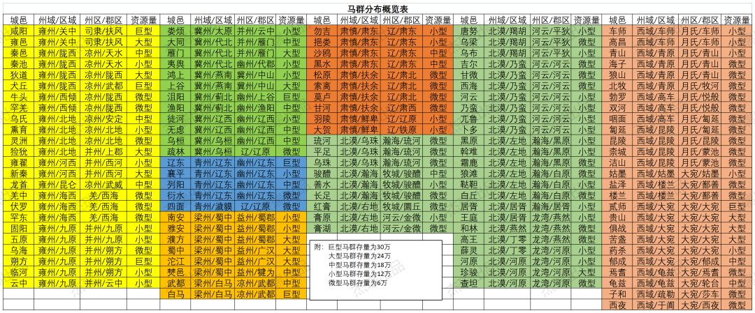 本表收录了全图所有马群资源的分布情况,根据汉匈战争剧本制作的,有些城邑名可能有所不一,如果有遗漏的恳请各位指正